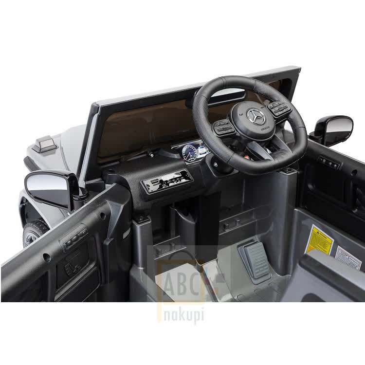 Otroški avto na akumulator Mercedes G 63 v srebrni barvi, velikosti 110 x 56 x 53 cm se ponaša z udobnim sedežem, kolesi iz EVA pene,blažilniki, LED prednjimi lučmi, in zložljivimi ogledali. Avto poganjata 2 dinamična 35W motorja in 4,5 Ah baterija. Ima USB priključek (MP3).