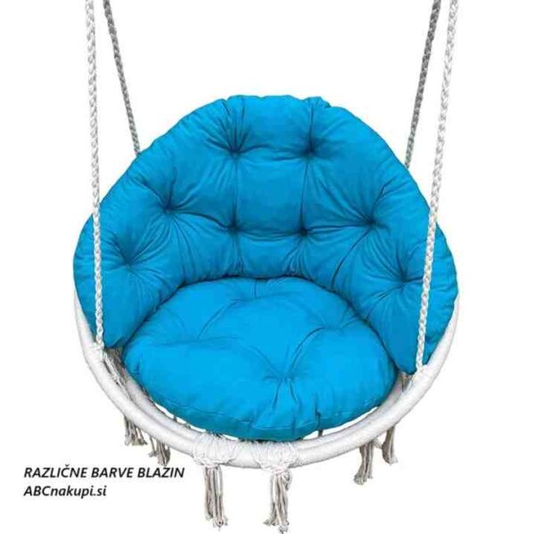 Visokokakovostnamehka in puhasta blazina ni namenjena samo za gugalne stole. Ta prešita sedežna blazina z bombažnim blazino zagotavlja visoko raven udobja. Blazina je sestavljena iz dveh delov, tako da se popolnoma prilega gugalnici / visečemu stolu. Mednarodna oznaka tekstilne varnosti. Izdelki s tem certifikatom so varni in brez škodljivih snovi v koncentracijah, ki negativno vplivajo na zdravje ljudi, m.in. pesticidi, klorofenoli, formaldehid, alergena barvila, prepovedana azo barvila in ekstrahirane težke kovine.