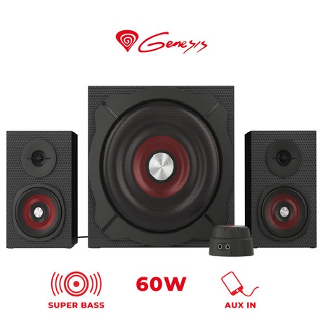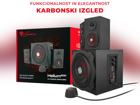 Dober zvok lahko vznemirljivo igro naredi še bolj privlačno. GENESIS Helium 600 je večkanalni komplet s 6.5″ subwooferjem, ki z močjo 30W RMS zagotavlja izjemno močne nizke tone in neverjetno raven nizkih frekvenc.  V kombinaciji z dvema 3″ satelitskima zvočnikoma z membrano in skupno močjo 30W RMS, ki zagotavljata visokokakovosten zvok na področju srednjih in visokih frekvenc, lahko uživate v izjemnem 2.1 prostorskem zvoku s 60W RMS skupne moči.