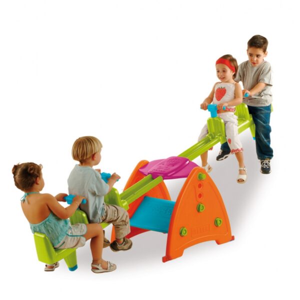 Barvita in stabilna gugalnica za štiri otroke je primerna za zunanjo uporabo, ima štiri ročaje in štiri velike sedeže. Vaši otroci bodo uživali v gibanju gor in dol, hkrati pa bodo lahko ob sončnih dneh uživali na svežem vetriču. Komplet je opremljen s 3-stopenjskim nastavljanjem višine, tako da lahko gugalnik uporabljajo tako mlajši kot starejši otroci. Vse skupaj je narejeno iz odporne in stabilne plastike prevlečene z ANTI-UV premazom, ki ščiti barve pred bledenjem. Gugalnica nima ostrih robov, kar zagotavlja varno in udobno igro otroka. Naj se zabava začne, kar na domačem vrt ali javnih mestih.