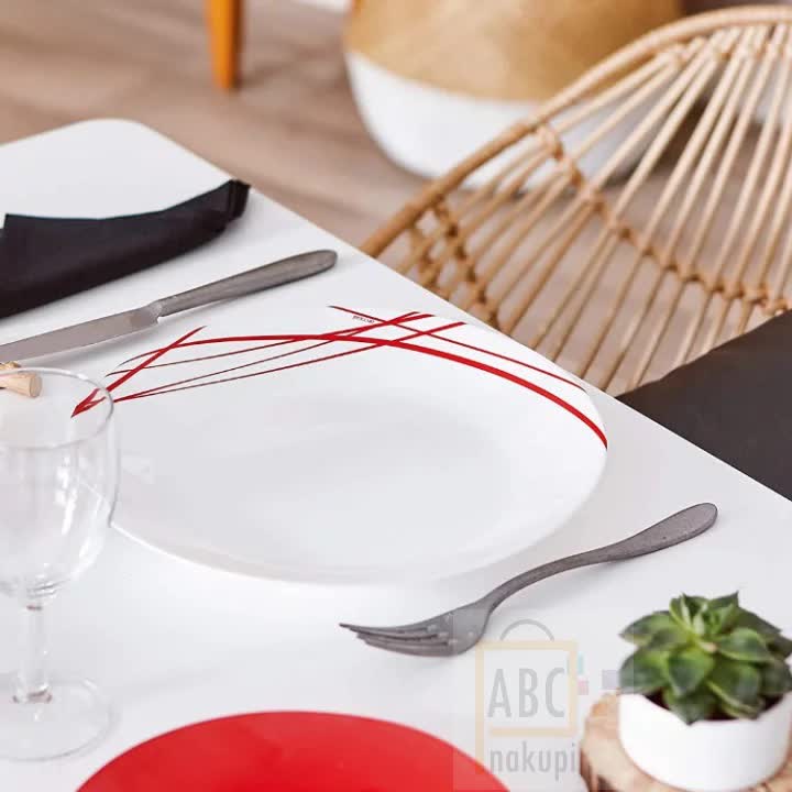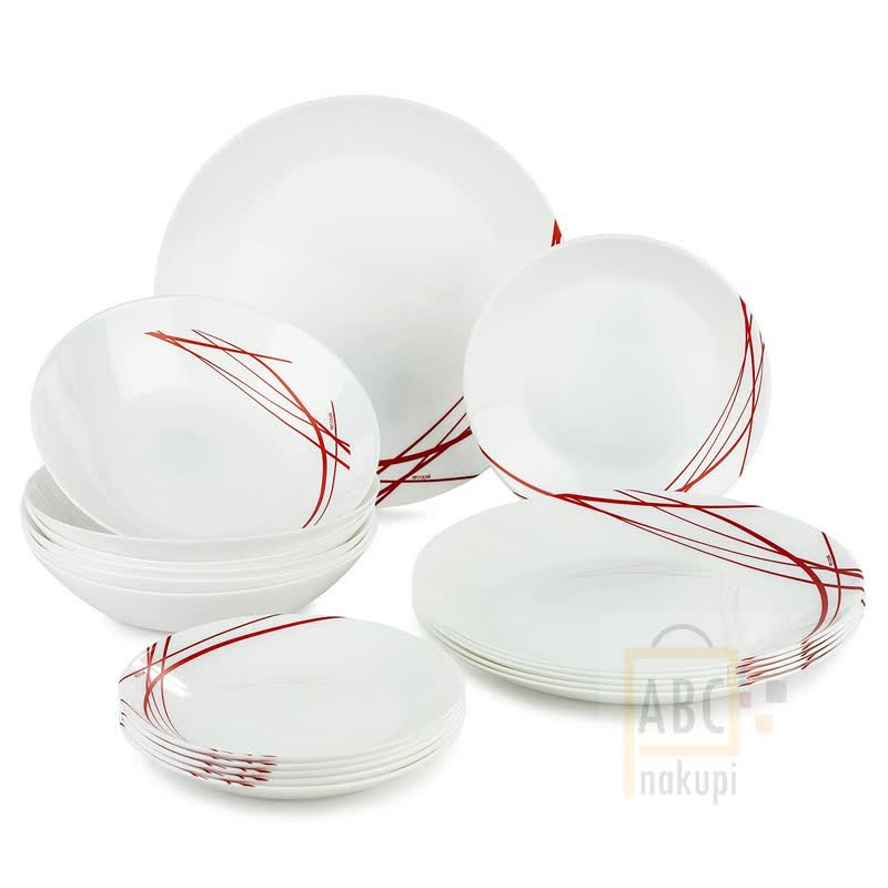 18 delni jedilni set Luminarc Domitille Rouge sestavljajo: 6 velikih plitkih krožnikov (26 cm), 6 globokih krožnikov (20 cm) in 6 desertnih krožnikov (18 cm).