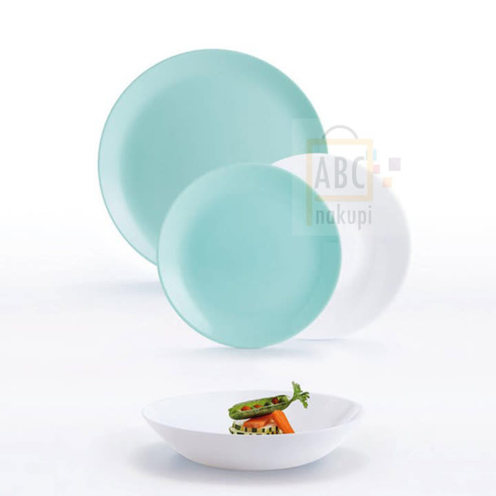 Predstavljamo vam 18 delni jedilni set Luminarc! Vrhunski set posode odporne na praske in udarce. Možnost pranja v pomivalnem stroju. Poseben način izdelave zagotavlja dolgotrajno kakovost in lesk z obeh strani. Set vsebuje 6 x veliki plitev krožnik- turkizna (25 cm), 6 globokih krožnikov-beli (20 cm) in 6 desertnih krožnikov -turkizna(19 cm). Naj vam krožniki poživijo vašo kuhinjo in ob serviranju dajo jedem poseben čar.