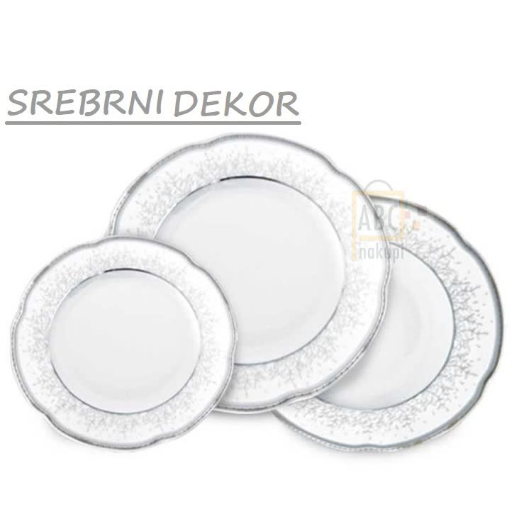 18 delni set iz porcelana s srebrnim robom in dekorjem Ćmielów ima dolgo tradicijo izdelave prvorazrednega porcelana. Set vsebuje 6 x velikih plitvih krožnikov (26 cm), 6 globokih krožnikov (22 cm) in 6 desertnih krožnikov (20 cm).