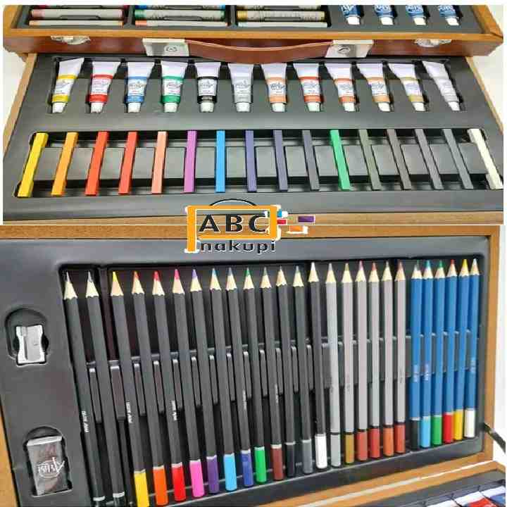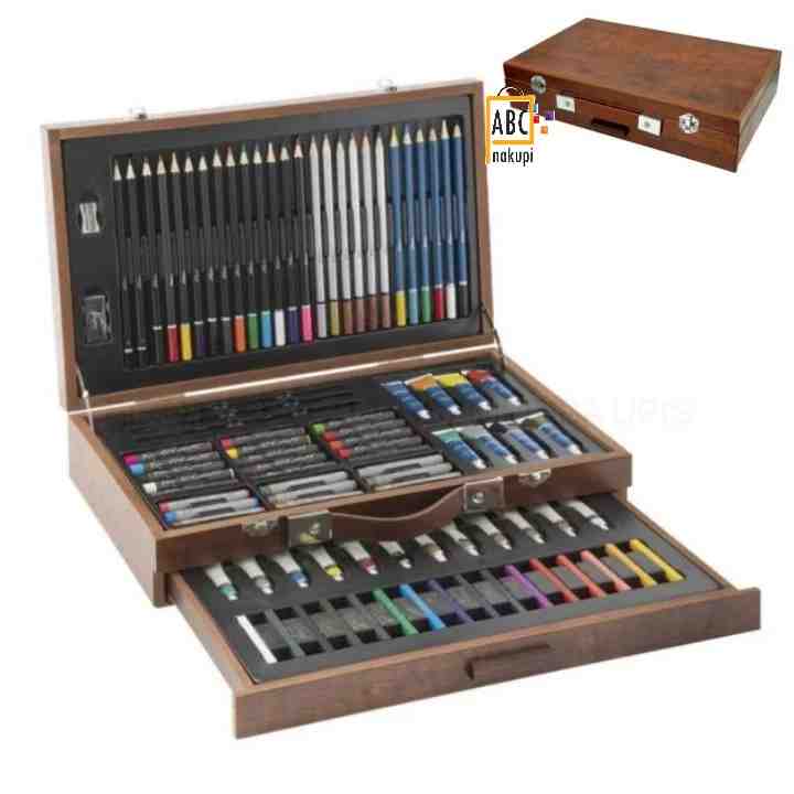 -Set vsebuje:akrilne barve, akvarele, oljne in pastelne barvice, čopiče, radirko, šilček in več