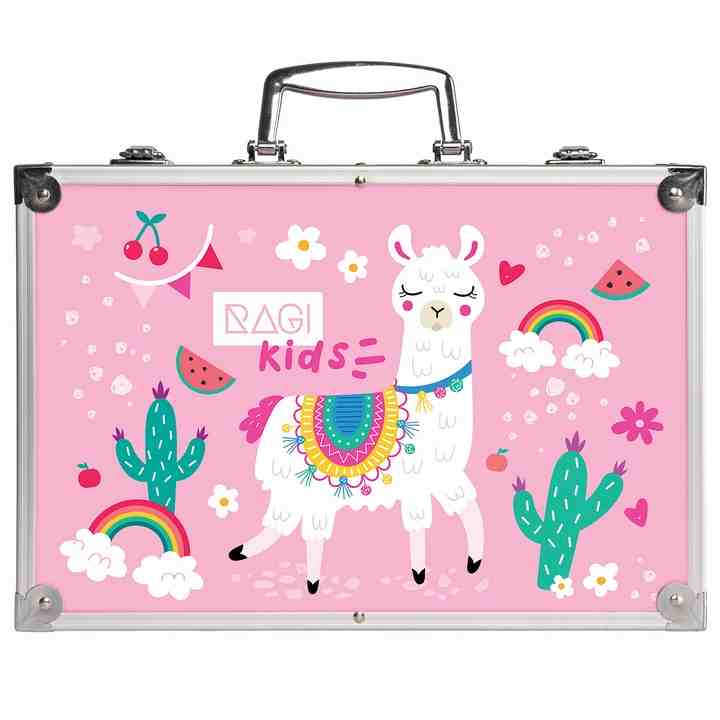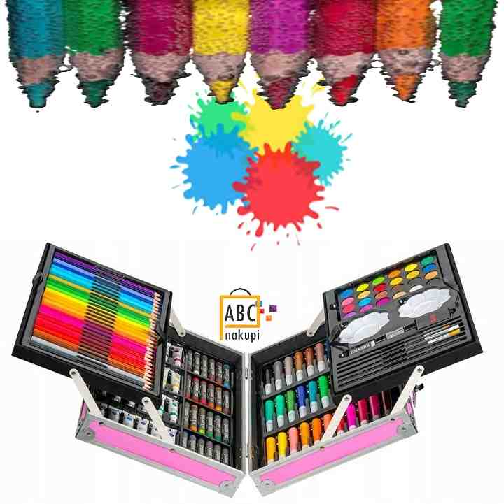 -Set vsebuje: 1x kovček, barvice, oljni pasteli, vodene barvice, markerji, šilček, radirko, čopič, lepilo,..