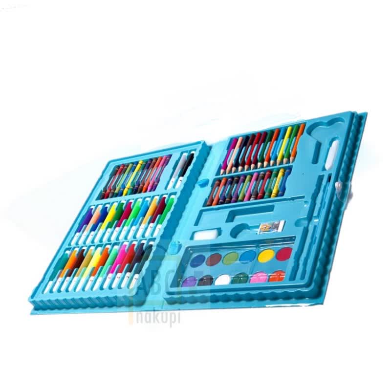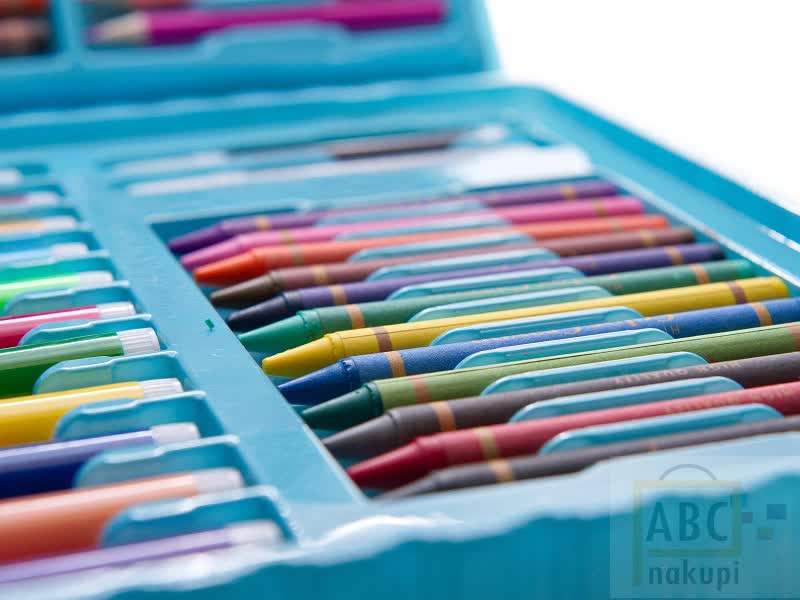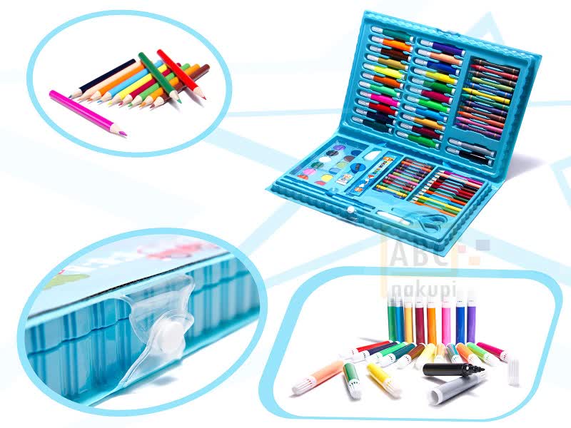 -Set vsebuje: 1x kovček, barvice, voščenke, vodene barvice, markerji, šilček, radirko, čopič, škarje, ravnilo,..