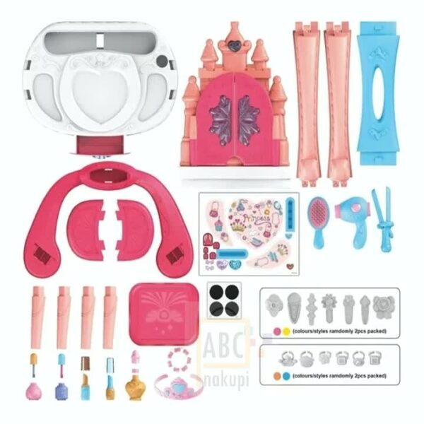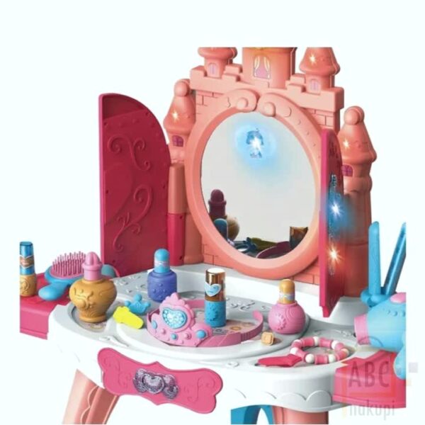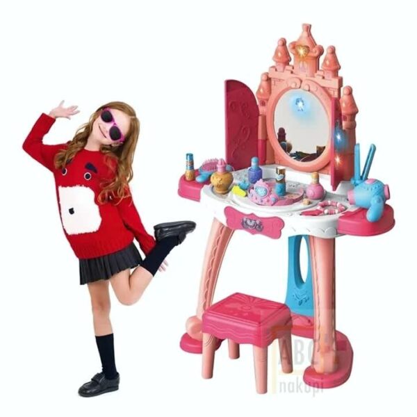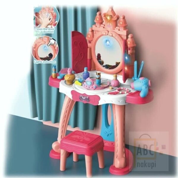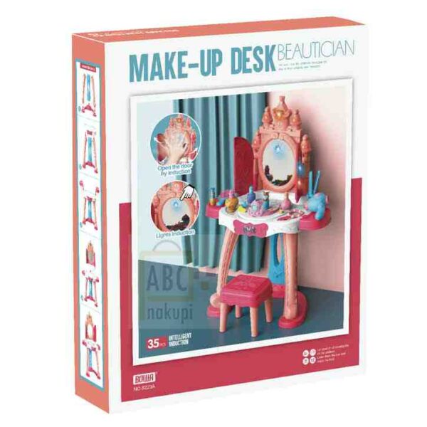 Lepotilna kozmetična mizica s stolom in kompletom ličil je igrača, ob kateri se bo vaša princeska rada igrala. Malčice bodo uživale v kvalitetni, varni in funkcionalni kozmetični mizici s kopico dodatkov. Mizici je priložen impresiven 35-delni set, ki vključuje različne dodatke za popolno nego obraza in telesa. Sortiment čopičev, ogledal, kozmetike in kozmetičnih organizatorjev predalov uporabnikom omogoča enostaven dostop do različnih orodij in izdelkov. Sistem luči na mizici zagotavlja svetlobo ki omogoča natančno oblikovanje in nanos ličil.