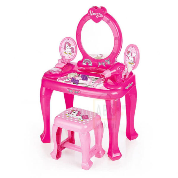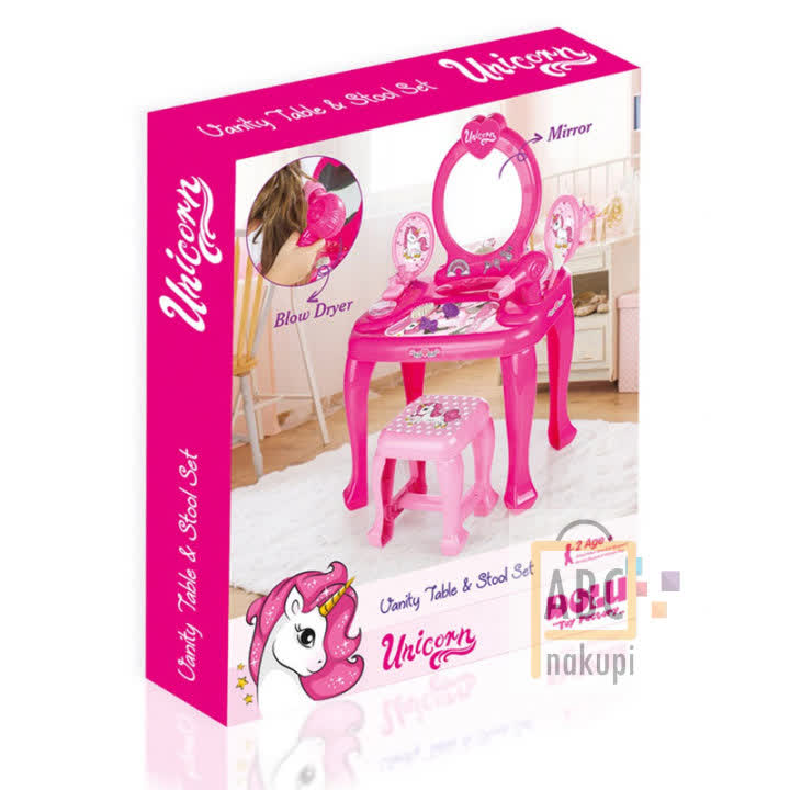 Kozmetična mizica s stolom je namenjena vaši najmlajši princeski in je primerne velikosti da se sama uredi za zabavo. Mizica jo popelje v čarobni svet pravljic v svet Unicorna. S pomočjo ogledala in stola se lahko hitreje in lažje nanesejo ličila, z glavnikom uredijo lase ali posušijo lase s sušilcem za lase.