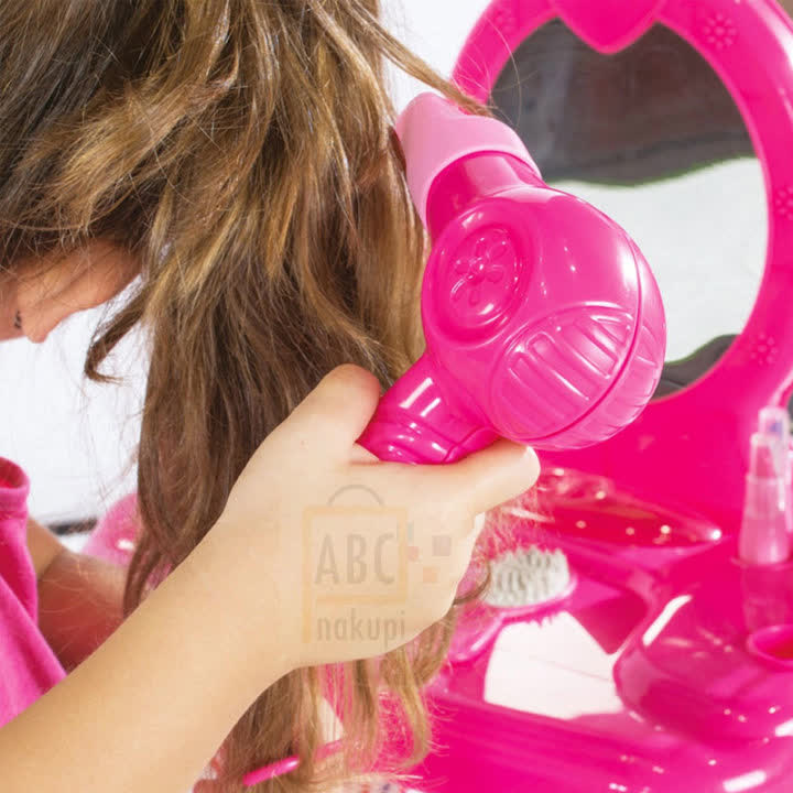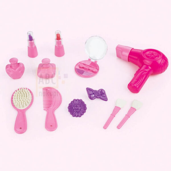 -Paket vsebuje: kozmetična mizica s stolom, 2 x parfumi, 1 x senčilo, 1 x čopič, 1 x glavnik, 1 x sušilnik za lase, 2 x vrtnica, 2 x lasnice, 2 x čopiči