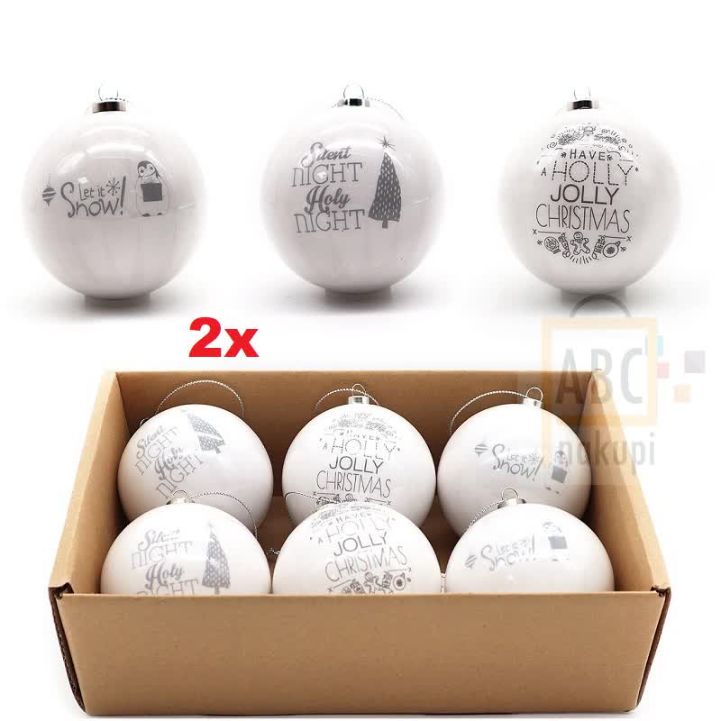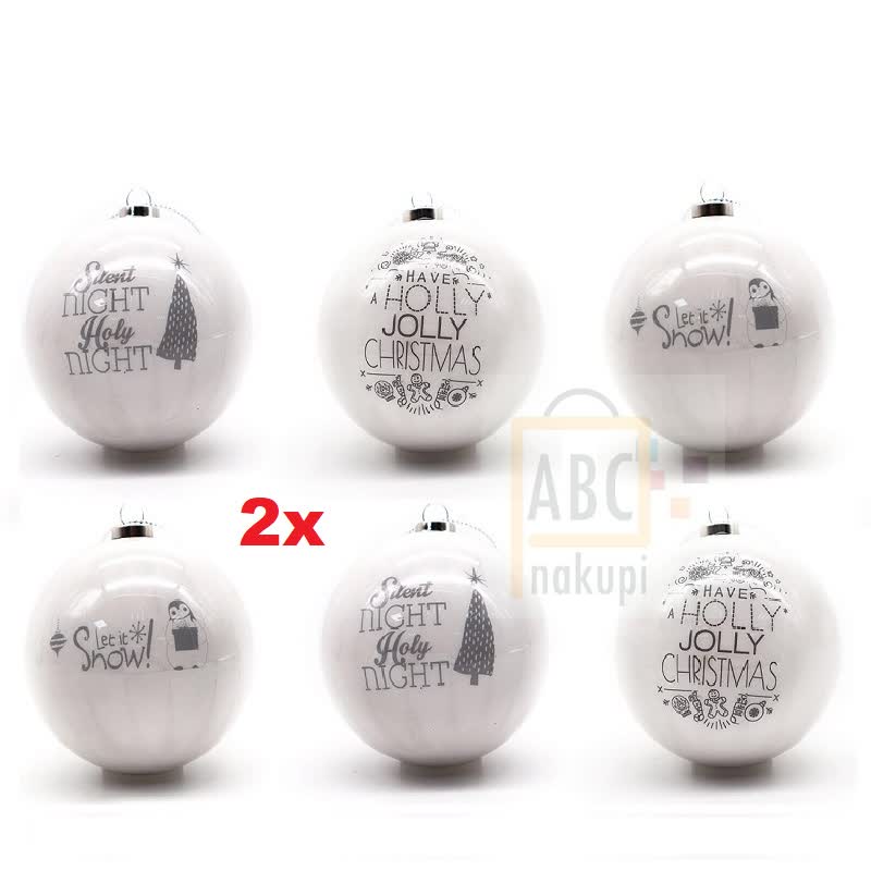 -Komplet vsebuje: Kroglice 7,5cm. Bele sijaj, z različnimi novoletnimi napisi in motivi.