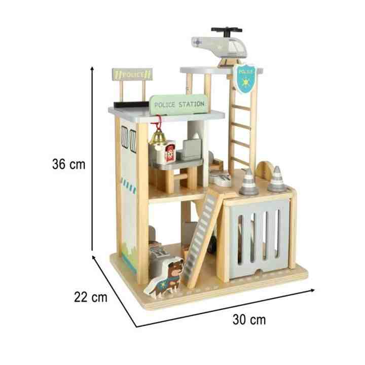 Lesena policijska postaja je primerna igrača za male ljubitelje reda in varnosti na cesti in zraku! Komplet vsebuje vse, kar potrebujete za ustvarjanje različnih scenarijev igranja – figuro policista, roparja in dresiranega psa ter številne kose pohištva in vozila: policijski avto in helikopter. Policijska postaja je trinadstropna in ima garažo, pisarno in pristajalno ploščad. Vse komponente so izdelane iz gladko brušenega lesa in pobarvane z nestrupenimi barvami.