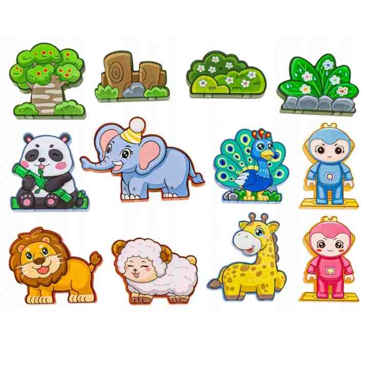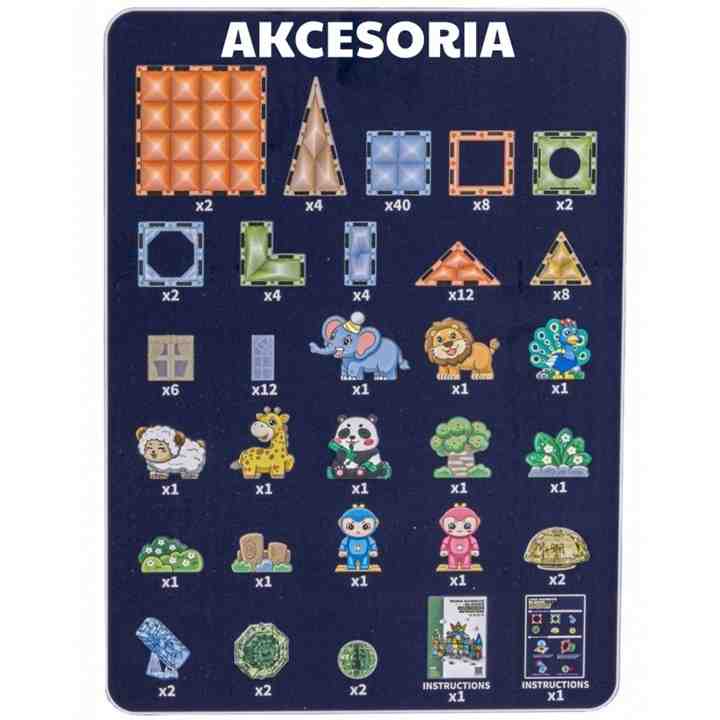 -Komplet vsebuje 124 kosov: magnetne kocke različnih oblik, figurice živali, figurice likov, tematski dodatki (drevo, kamenje)in navodila z vzorčnimi modeli