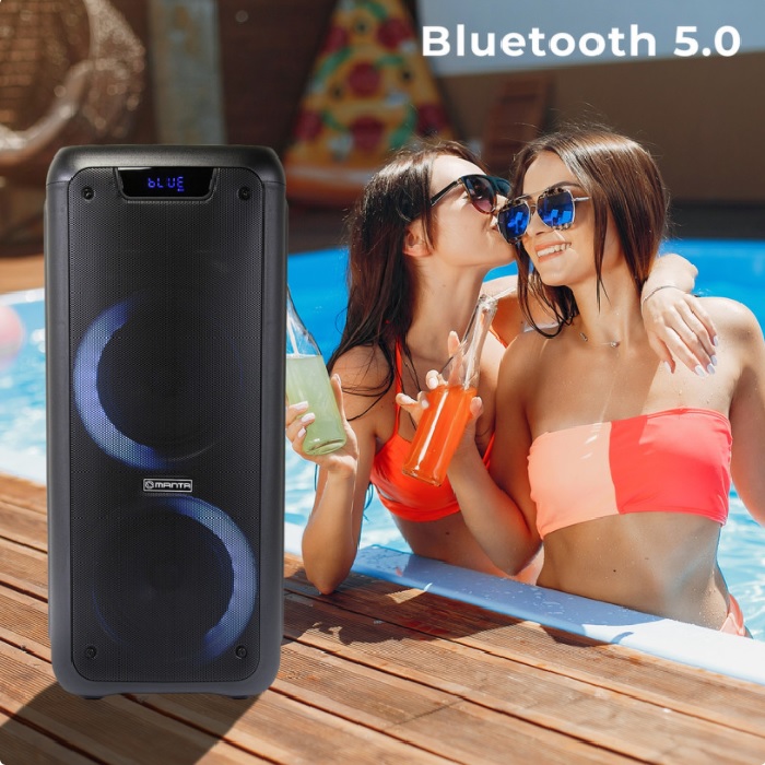 Karaoke zvočnik MANTA SPK5210 je pravi multimedijski center, saj ima vgrajeno hitro Bluetooth 5.0 povezavo za povezavo z vašimi pametnimi napravami. Glasbo lahko predvajate tudi iz USB naprav, microSD spominskih kartic ali pa direktno preko AUX vhoda (MP3 predvajalnik, prenosni računalnik, itd…).