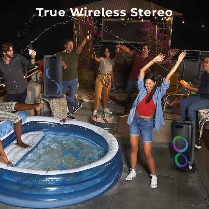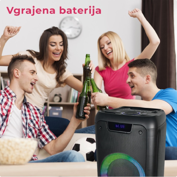 Zvočnik v sebi skriva zmogljivo polnilno baterijo, priložena sta tudi daljinski upravljalnik in žični mikrofon, skupaj pa bodo poskrbeli za nepozabno KARAOKE avdio dogodivščino, kjerkoli in kadarkoli!