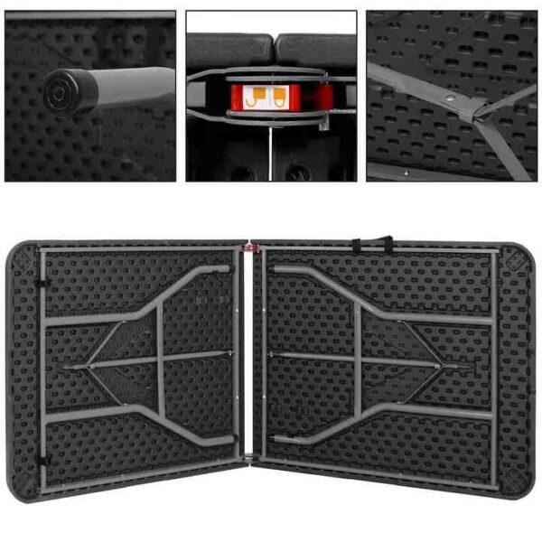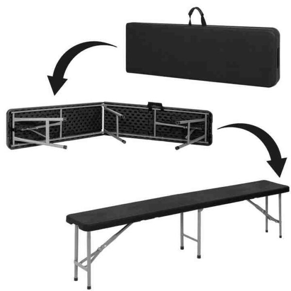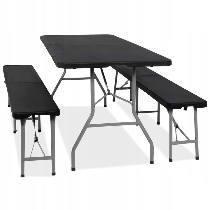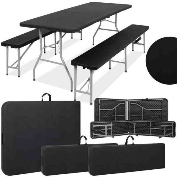 Zložljive vrtne klopi in miza črne barve so popolne za vsak dogodek, vsak prostor! Oblikovana je iz kakovostne plastike, ki vzdrži vse vremenske sezone. Zaradi tega so klopi in miza primerna za notranjo in zunanjo uporabo. Vse skupaj je zelo preprosta za prenašanje, ker so zložljiva in pri tem ima varovalo, da se zaklene. Da jo lažje prenašate na okrog ima udoben ročaj. Vsak element je opremljen z ročajem za nošenje (črna, tkanina + guma).