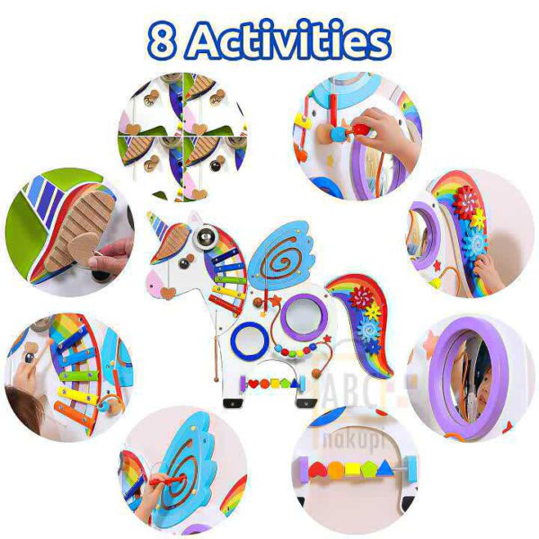 Večnamenska senzorična plošča- Viga Toys s podobo Unicorna je sestavljena: iz 4 delov in ima 8 različnih igralnih funkcij. Pisan Unicorn ponuja; zobniški prenos, spirala kroglic, konkavno in konveksno ogledalo, labirint z magnetnimi kroglicami in metalofon.