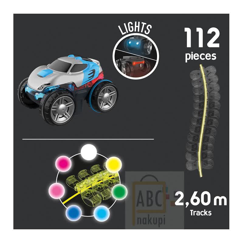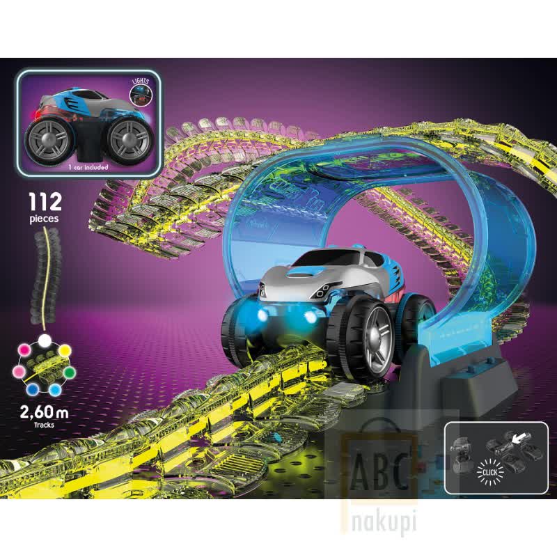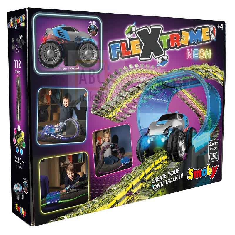 Komplet Flextreme Neon ti daje možnost, da ustvariš svojo progo, ki ti omogoča, da doživiš dih jemajoče spuste, neverjetne zanke, vznemirljive zavoje in še veliko več. Ne glede na to, ali gre za zanke, ekstremne klance, navdušujoče spirale ali ozke zavoje – na dirkalni stezi Smoby Flextreme ne bo nikoli več dolgočasno. Prilagodljiva in modularna dirkalna steza zagotavlja nore steze in razburljive vožnje v otroški sobi. Naj se divja vožnja začne, kar v tvojii sobi!