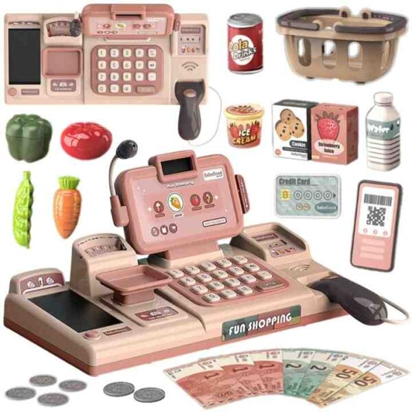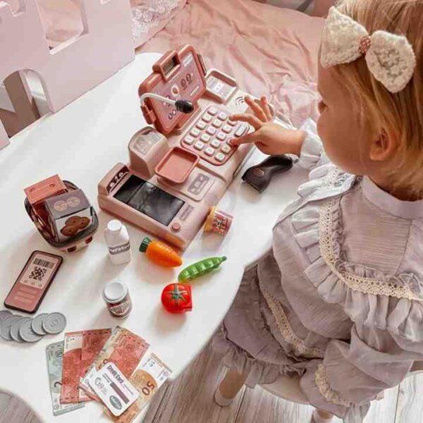 S to prvo otroško blagajno na baterije se bo otrok naučil osnov pri poslovanju v trgovini in postal zadovoljen lastnik trgovine. Vaš otrok se bo naučil, kako ravnati z denarjem in kako je videti nakupovalni proces v trgovini. Otroci lahko tehtajo sadje in zelenjavo, s pomočjo bralnika lahko skenirajo zavojček piškotov ali steklenico vode. Plačilo pa se lahko izvede na več načinov: tradicionalno z gotovino, plačilno kartico ali pametnim telefonom. Vse to je vključeno v komplet in bo vašemu otroku zagotovilo veliko ur zabave.