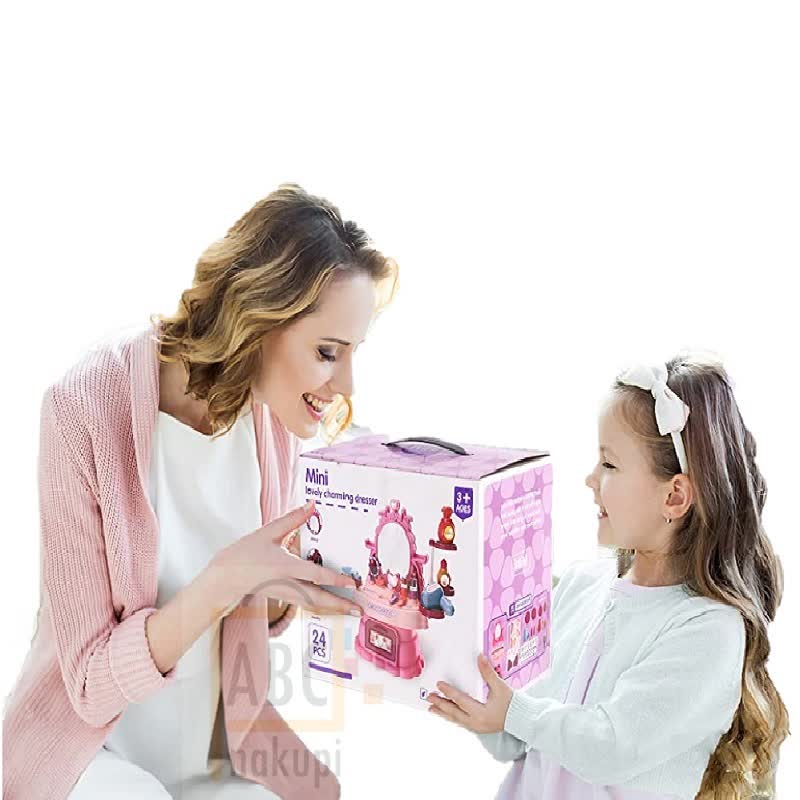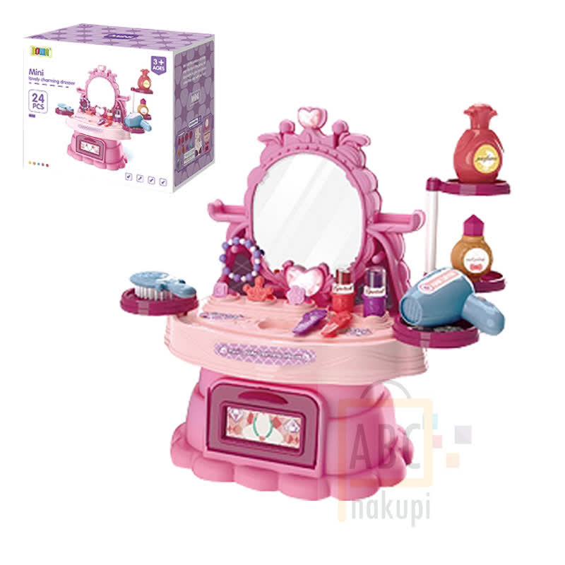 Otroška kozmetična mizica 2/1 ponuja veliko kosov pripomočkov za ličenje in urejanje pričeske. Kozmetična mizica ima vse pripomočke da urediš sebe, prijateljice ali mamico. 24-delni mini komplet vključuje omarico za shranjevanje in druge dodatke, kot so šminke, nakit, fen, obroč,… Ogledalo zagotavlja, da sta ličila in pričeska vedno urejena.