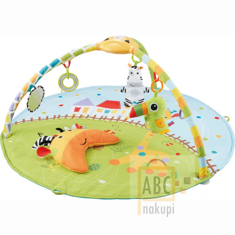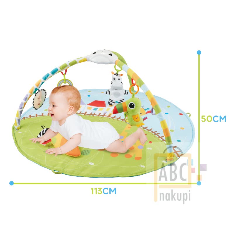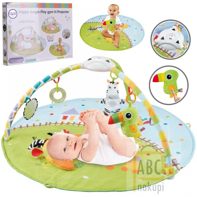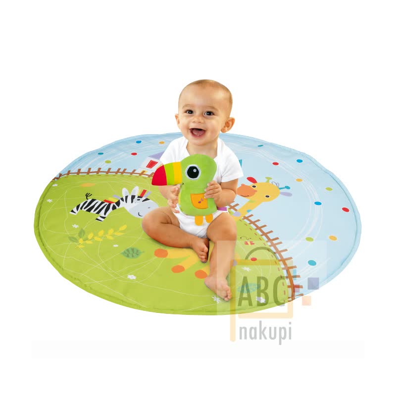 Barvna podloga za najmanjše, na kateri raziskujejo svet barv in med drugim poslušajo pomirjajočo glasbo. Podloga za najmlajše s premerom 104 cm s hišnimi ljubljenčki je kot nalašč za vsakega otroka. Med drugim ima snemljiv glasbeni projektor, ki se lahko uporablja skupaj z blazino ali ločeno. Izbirate lahko med 8 pomirjujočimi melodijami, medtem ko projektor projicira zvezde in luno na strop. Komplet vsebuje 4 igrače (zelena papiga z glasbenimi učinkom po pritisku na krila, zebra, ogledalo, obroč), ki spodbujajo vsa čutila. Lahko jih obesite na drogove ali jih zamenjate z drugimi igračami.