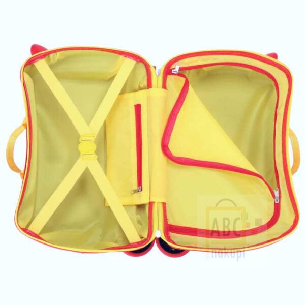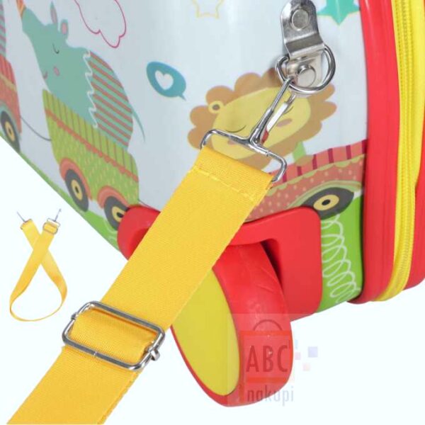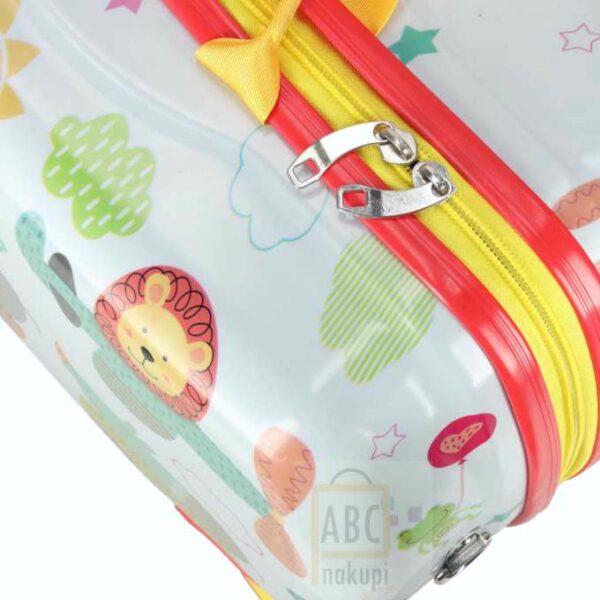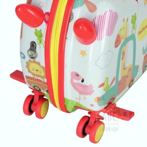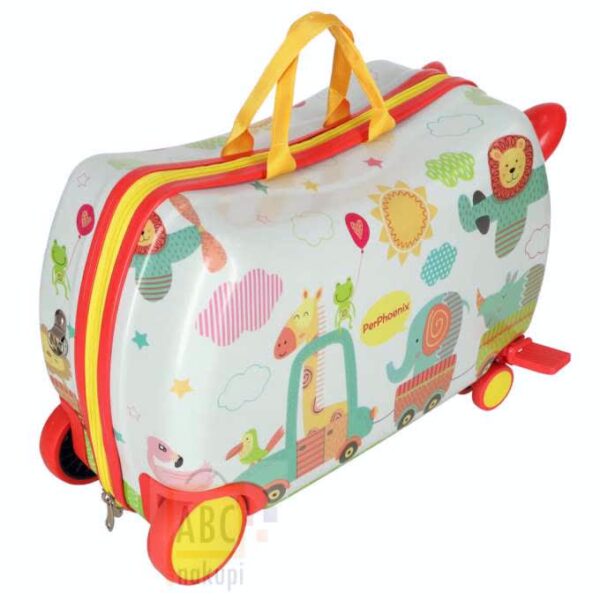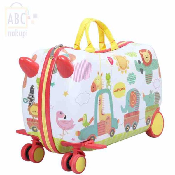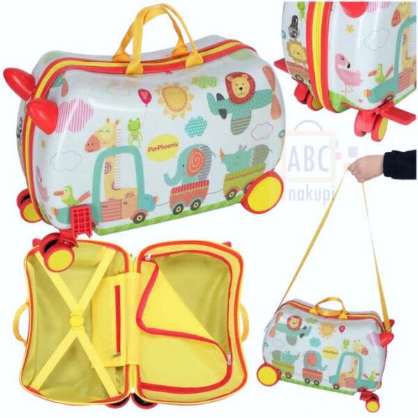 Kako potovati v svojem stilu! Potovanje z otroki je lahko mučno – vendar imamo preprosto rešitev! Očarljiv kovček na kolesih z grafiko navihanih živali bo ukradel srce marsikoga. Všeč bo tako otrokom kot odraslim! V primerjavi z drugimi potovalnimi torbami in kovčki ima ta otroški kovček dodatno funkcijo – lahko se uporablja kot sedež in celo kot voziček za otroke! Kovček je, izjemno prostoren ima dva velika predala (tudi eden na zadrgo) nudita dovolj prostora za vse potrebne stvari: oblačila, plišaste živali in vse ostalo, kar bo malček potreboval med potjo. Majhen žep z zadrgo pa bo držal vse malenkosti, ki jih vaš otrok želi spakirati. Drugič, kovček lahko udobno nosite z ročaji ali ga obesite čez ramo. Vendar pa bo otrokom najbolj prijazna možnost njegova sposobnost vlečenja.