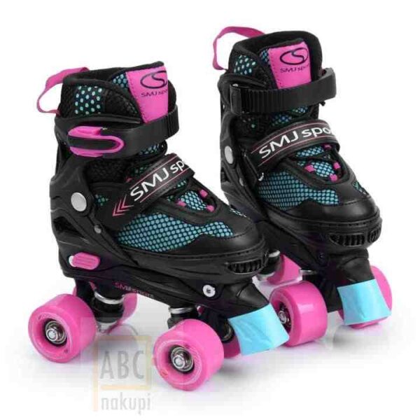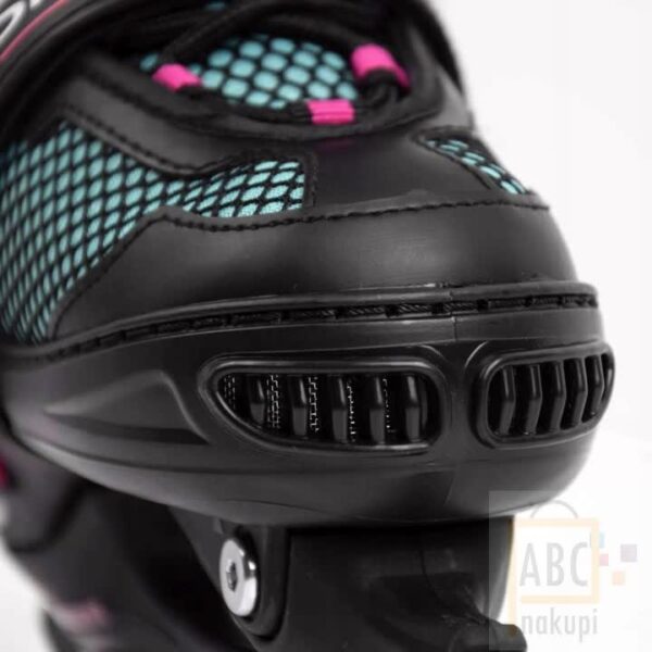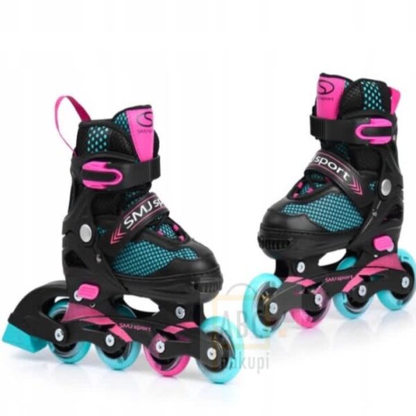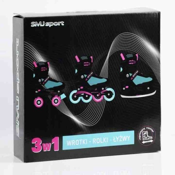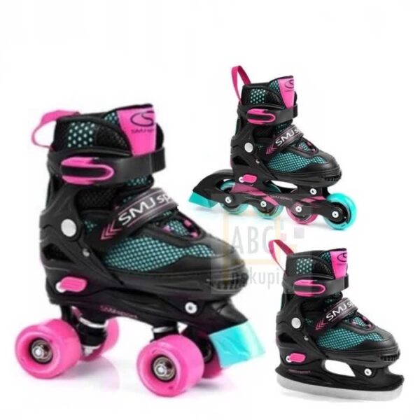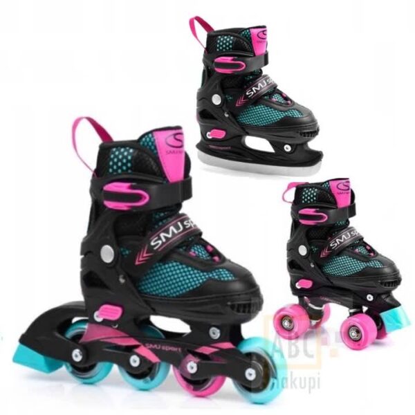 Večnamenska skate–roller–skate z možnostjo prilagoditve velikosti čevlja do 42. Nastavljivi čevelj omogoča rastočemu otroku, da jih uporablja več let zaporedoma – v zimskih mesecih kot drsalke, v preostalem delu leta kot rolerji ali kotalke. Mehka in udobna podloga v notranjosti se segreje in zagotavlja ustrezen dovod zraka. Zaponke imajo sistem AUTO LOCK, ki preprečuje, da bi se pritrdilni elementi med uporabo odvezali ali zrahljali. Valjčni drsnik iz aluminija. PU kolesa (tako imenovana guma) tiha, mehka, nameščena na zelo kakovostnih ležajih ABEC-5. Če želite spremeniti velikost, pritisnite gumb pod peto in držite sprednji del čevlja ter ga razmaknite za ustrezno razdaljo, dokler ne zvočno kliknete. Pri prilagajanju velikosti zrahljajte vezalke, odvijte ježka in zaponko. Zamenjava drsalke z rolerji ali kotalke je sestavljena samo iz odvijanja dveh pritrdilnih vijakov, vstavljanja izbranega drsnika in zategovanja vijakov nazaj.
