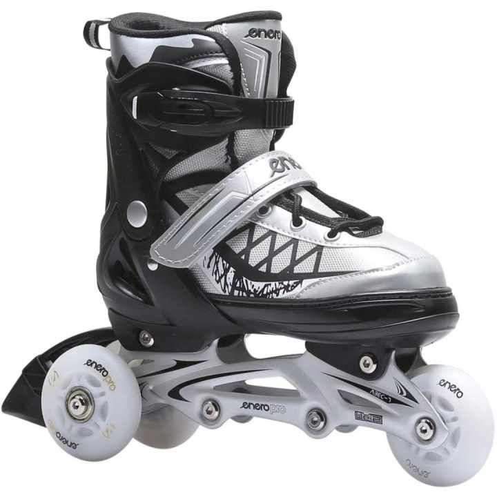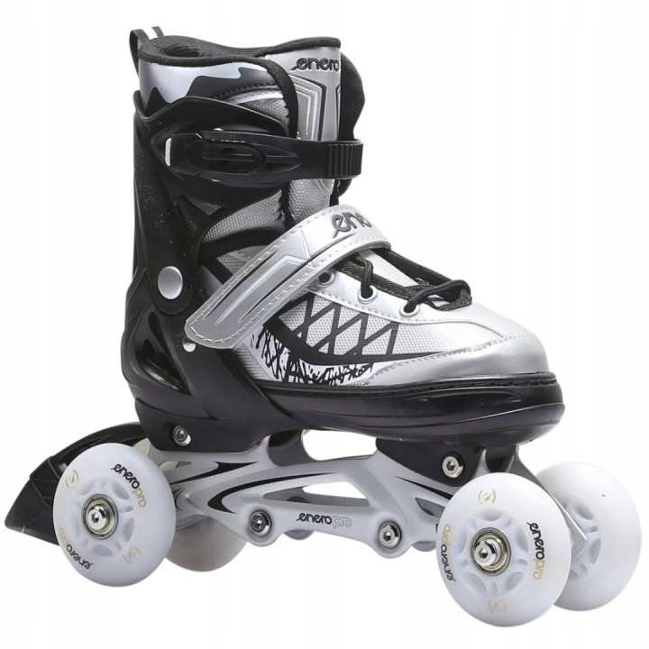 Večnamenska skate–roller–skate z možnostjo prilagoditve velikosti čevlja do 41.Nastavljivi čevelj omogoča rastočemu otroku, da jih uporablja več let zaporedoma – v zimskih mesecih kot drsalke, v preostalem delu leta kot rolerji, kotalke ali tri rolerji.Opremljeni so z lahkimi in močnimi aluminijastimi drsniki, zavorami, mlečnimi kolesi premera 67 mm z LED lučmi, ki sijejo belo, tremi nastavljivimi nosilci in nastavitvijo velikosti. Kolesa in ležaji razreda ABEC7 omogočajo manjši kotalni upor za uporabo na dolge razdalje in rekreativno vožnjoOjačan vrh čevljev, zaščiten z vodoodporno plastjo, široko udobno prileganje in mehko oblazinjenje okoli gležnja znatno povečajo udobje uporabe med vožnjo. Drsalniki za drsanje na drsalkah so izdelani iz trpežne kovine, odporne na poškodbe in rjo. Za varno vožnjo boste potrebovali dodatke, kot so čelado in ščitnike!