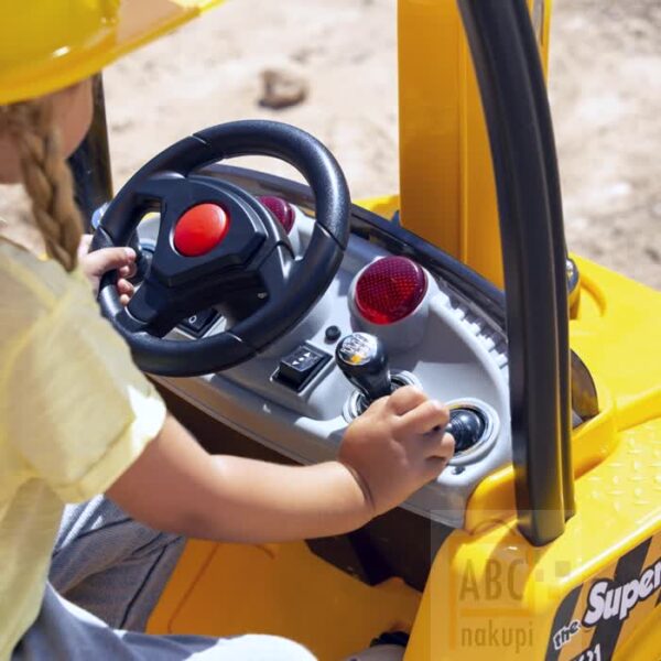 Bager se premika naprej in nazaj. Vam ponuja: prostoren predal za shranjevanje na zadnji strani bagra, v katerega lahko skrijete sladkarije ali igrače. Uporablja funkcijo lopate kot prava z zgibno roko in lopato. Največja hitrost: 3,2 km/h.