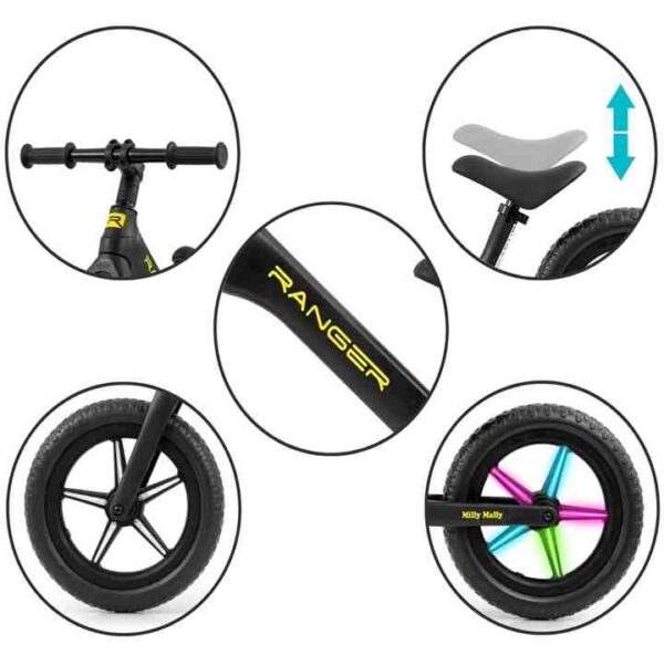 Kolo brez pedalov – poganjalec znamke Milly Mally, je namenjeno začetnikom, ki niso pripravljeni voziti pravega kolesa in poganjati s pedali. Kolo bo zagotovo spodbudilo najmlajše k vadbi zunaj doma, hkrati pa bo zelo privlačna alternativa tradicionalnemu sprehodu. Trpežna in izdelana v najnovejši tehnologiji EVA pene, 12-palčna kolesa, odporna proti prebijanju, ki jih ni treba napihniti, jih naredijo brez vzdrževanja. Ergonomsko, višino nastavljivo sedež z mehkim oblazinjenjem zagotavlja, da se otrok udobno vozi in raste skupaj z njim. Kolo ima krmilo z ležaji in kolesi. Nedrseči, mehki gumijasti ročaji zagotavljajo trden oprijem in udobno rokovanje. Ergonomska zasnova kolesa zagotavlja vzdržljivost in udobje uporabe. Trden in izjemno lahek kompozitni okvir kolesa. Kolo je prilagojeno dolgotrajni uporabi najmlajših in je zaradi majhne teže udobno za nošenje.