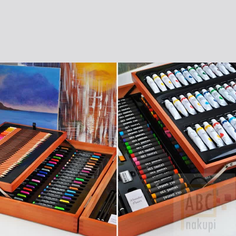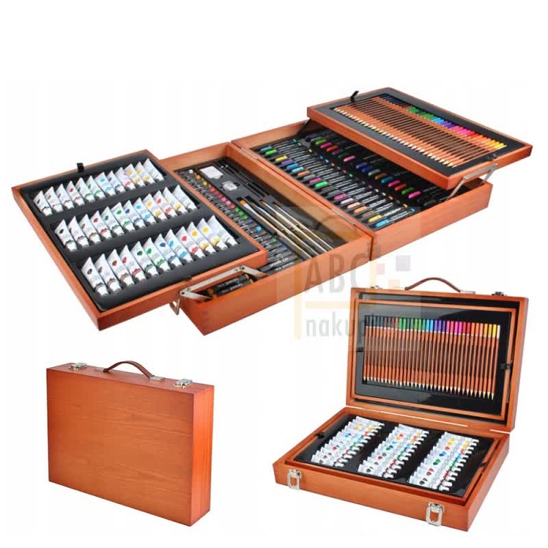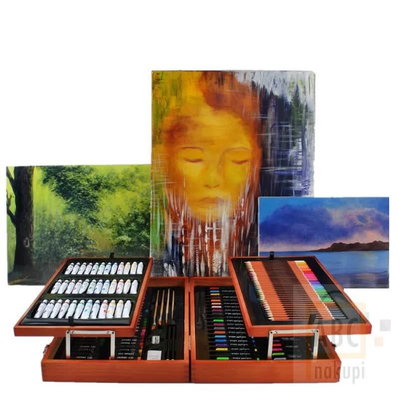 -Set vsebuje: 1x kovček v lesu, barvice, oljni pasteli, akvarel, akrilna barva, čopiči,..