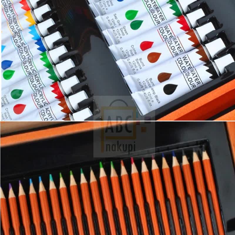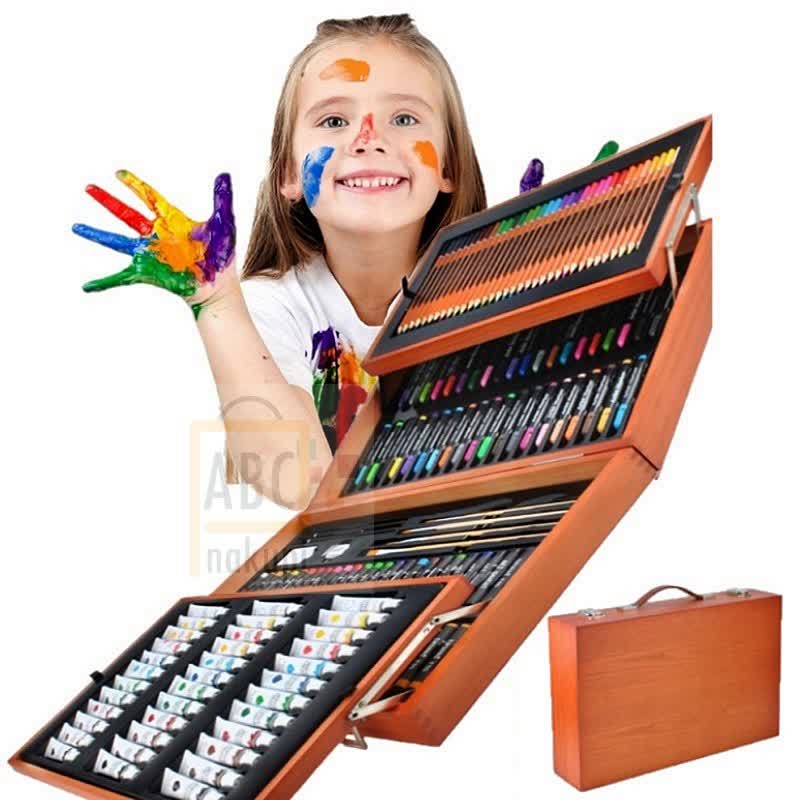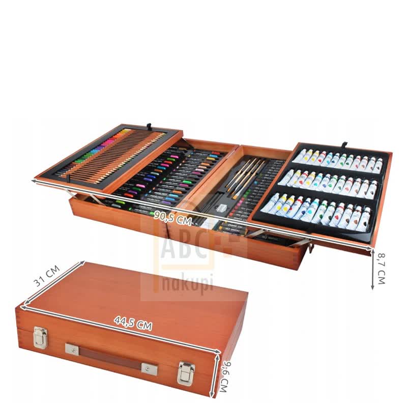 Super Set –174 delna ekskluzivna umetniška in slikarska garnitura v kovčku, kot nalašč za ustvarjalne otroke in odrasle! V tem kovčku imate na voljo vse, kar potrebujete za svoje umetniške projekte, ne glede na to, ali želite slikati, risati ali barvati. S pomočjo obsežne izbire 54 oljnih pastel, 34 barvnih svinčnikov, 36 različnih vrst barv (12 kos oljnih barv, akrilnih barv in akvarela), 42 markerjev, 2 svinčnika, 4 čopiče, šilček in radirka s katerimi bomo enostavno proizvajali najbolj ustvarjalna, namišljena in izvirna dela. Predmeti so izdelani iz visoko kakovostnih materialov in imajo široko in privlačno paleto barv. Artefakti varno ostanejo v kovčku, zato jih lahko vzamete s seboj kamorkoli. Ohišje kovčka je izdelano iz lesa, s praktičnim ročajem in dvema ključavnicama. Kovček z barvami lahko vzamemo s seboj npr. na univerzo, šolo, v park ali počitnice.