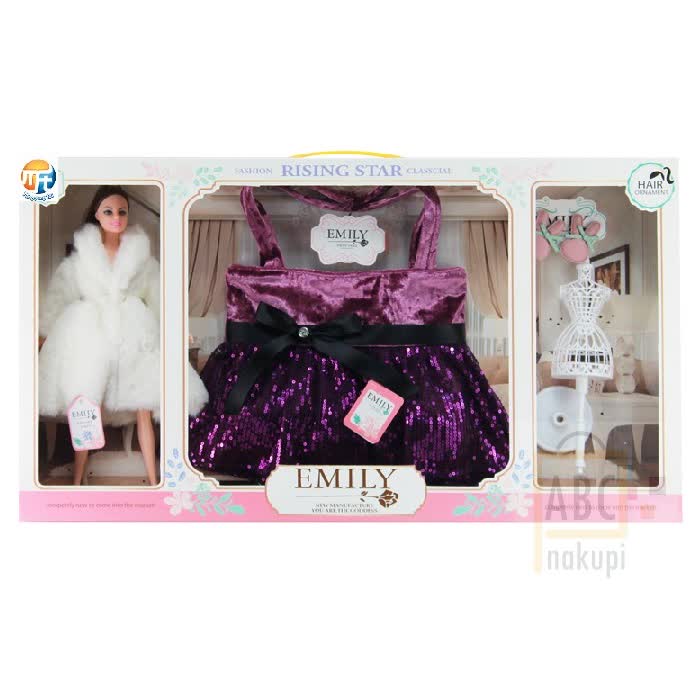 Otroška igrača punčka Emily s priborom in lepo torbico. Punčka je iz mehkega vinila prijetna na dotik, oblečena v lepi beli krzneni plašč in čudovito prinčesko. Punčka Emily bo prijetna igrača za vašo malčico, saj jo bodo navdušili modni dodatki. Zraven igrače Emily dobi še prikupno torbico, ki ji bo služila za nakup v trgovini.