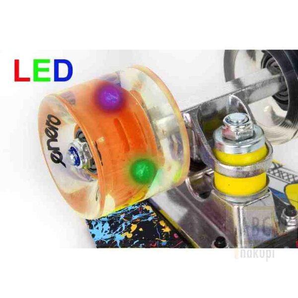 Skateboarding je šport, ki otrokom ne daje le zabave, temveč tudi izboljšuje telesno pripravljenost in stimulira vse mišice. Zgornja plast rolke je nedrseča površina in bo otroku zagotovila dober oprijem ter stabilnost, tako da med vožnjo ne bo izgubil nadzora. ABEC 7 ležaji omogočajo gladko in hitro vožnjo. Majhnost in teža rolke bosta otroku omogočili enostavno shranjevanje in prevoz izdelka. Žareča kolesa z LED lučmi ne bodo samo povečala vidljivosti in varnosti vašega otroka, temveč se bodo tudi zabavala med vožnjo. Ne oklevajte pri nakupu, pridružite se skupini srečnih staršev in zadovoljnih otrok!