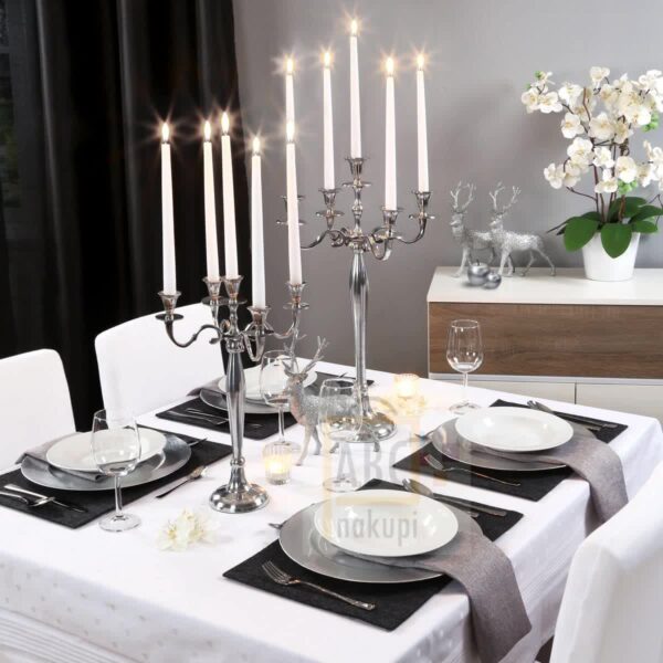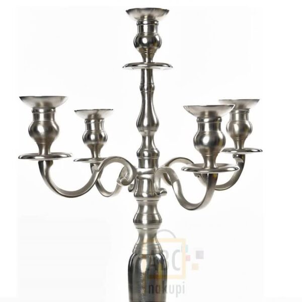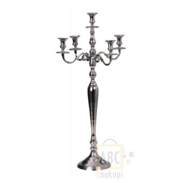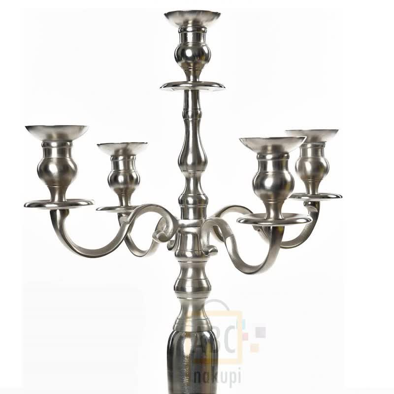 Svečnik srebrne barve za 5 sveč se bo prilegal vašim sobam, porokam, božiču ali prireditvam, katerim podari elegantno in razkošno vzdušje. Svečnik je izdelan iz kovinske zlitine in je tudi ponikljan. Ima zaščito pred madeži, ki prihrani nenehno čiščenje in poliranje. V izbrani velikosti je višina 79 cm. Z našimi svečniki lahko uporabljate vse standardne barske sveče ali steklene vložke s premerom do 22 mm. Primerno za vsak kotiček doma.