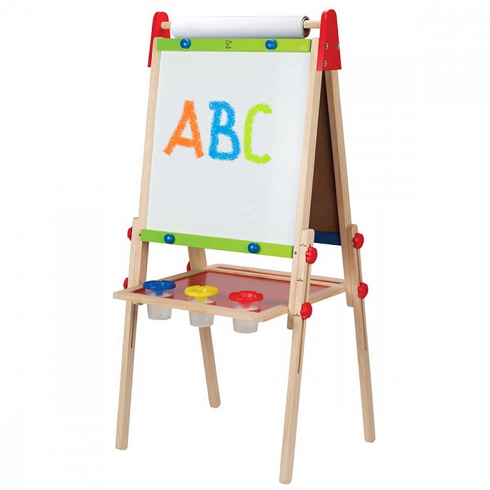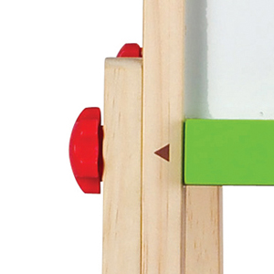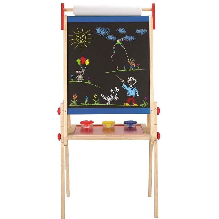 Predstavljamo vam tablo iz lesa s katero bo vsaka otroška umetnija postala popolna umetnina. Tabla je izjemno kvalitetna in nastavljiva po višini vašega malega umetnika. Na eni strani gre za klasično tablo za risanje s kredo, na drugi strani pa je bela tabla za risanje s flomastri. Na vrhu je pritrjena rola s papirjem, da lahko ustvarjamo tudi z akvarelnimi barvami. Pod tablo je polica za odlaganje za lončei za vodo s pisanimi pokrovčki.