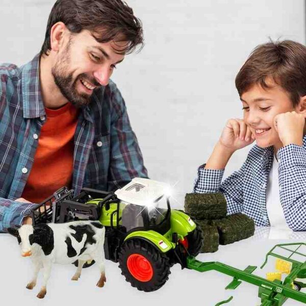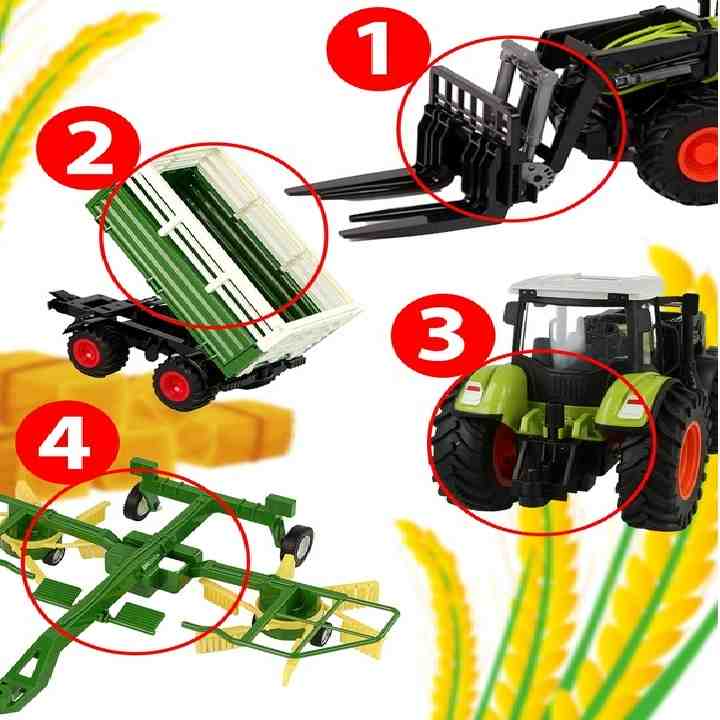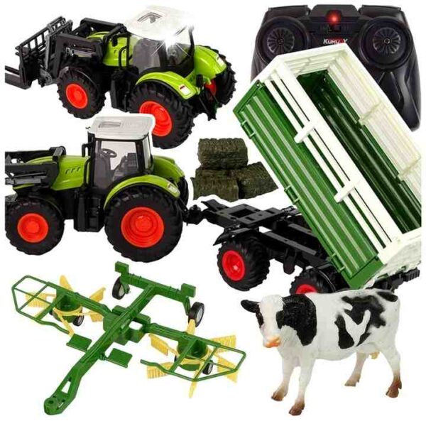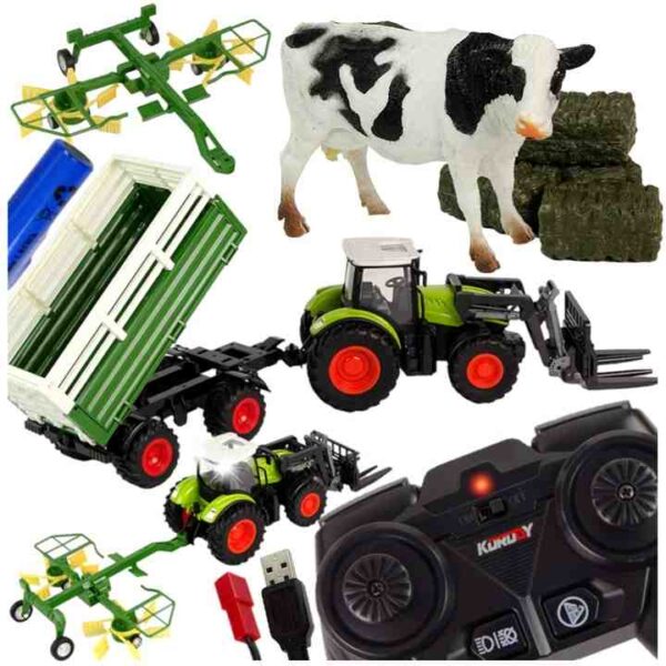 -Set vključuje: daljinsko vodeni traktor R/C, daljinski upravljalnik, prikolica s prekucnikom, grablje za seno, figurica krave, 4x stisnjena kroglica za seno, 500mAh 3.7V baterija in USB polnilni kabel
