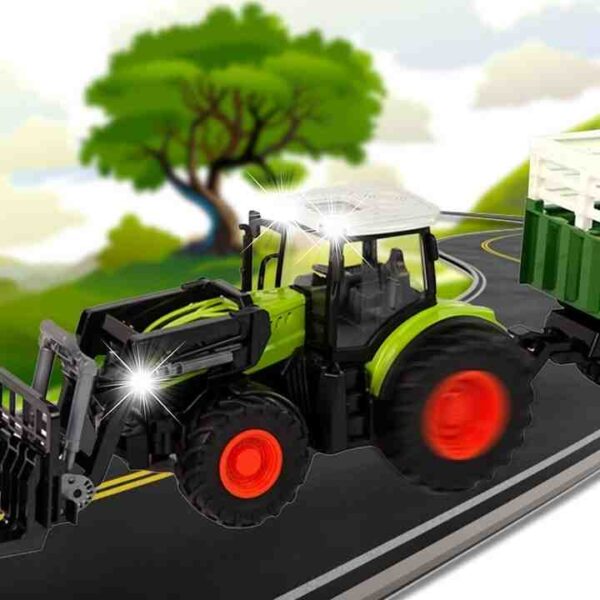 Pomoč dedku na polju in priložnost za vožnjo s kmetijskim strojem z dodatki je neverjetna zabava za vašega malčka. Gledanje težkih kmetijskih strojev je zanje zelo zabavno. Zahvaljujoč temu daljinsko vodenemu traktorju bo lahko sam postal pravi majhen kmet. Predstavljeni komplet je reproduciran v merilu 1:24, zaradi česar je večji od standardnih kompletov, ki se prodajajo na trgu. S svojo veliko velikostjo se lahko vaš otrok igra brez ovir in igra različne prizore in scenarije. Majhen daljinec ima samo štiri funkcijske gumbe, zato je njegovo delovanje zelo preprost:tipka levo – vožnja naprej / nazaj-tipka desno- vozite desno / levo.Levi gumb – vključujoče/samo luči-Desni gumb – samodejni demo način.