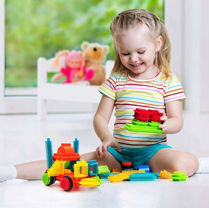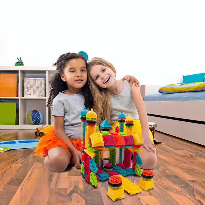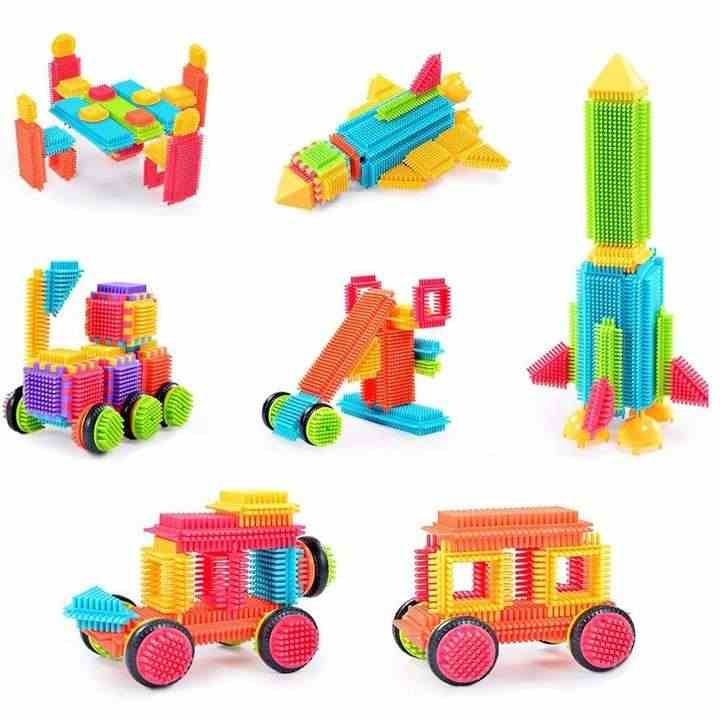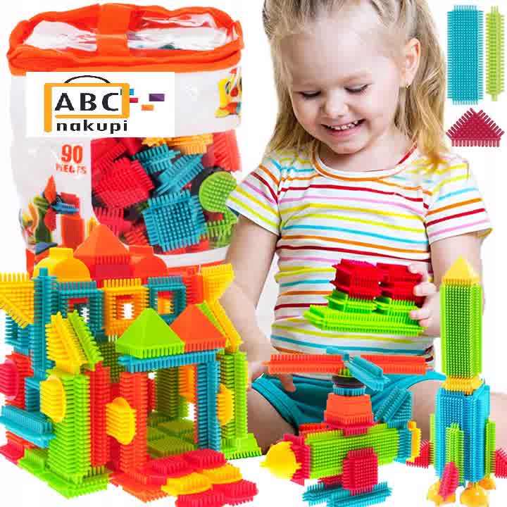 Barvite pisane kocke 90 kosov – pravokotni, kvadratni, trikotni, navadni in vrtljivi krogi ter “krošnja” koncev. Če želite, da bodo vsi elementi igrače po igranju urejeni, jo lahko enostavno zaprete v vrečko z ročajem. To vam omogoča, da ga ohranite čistega, pa tudi, da vzamete kocke s seboj. To je odlična ideja za vsako potovanje – ne zavzema veliko prostora in otroka dolgo časa zasede.
