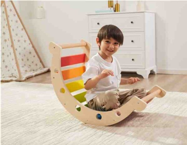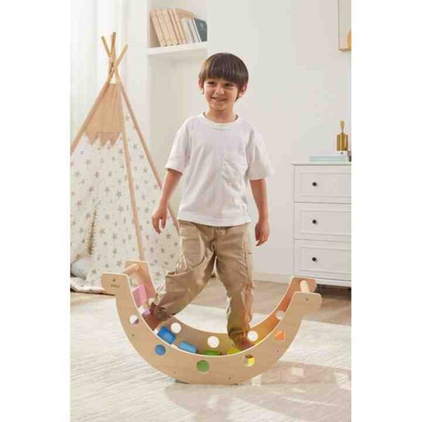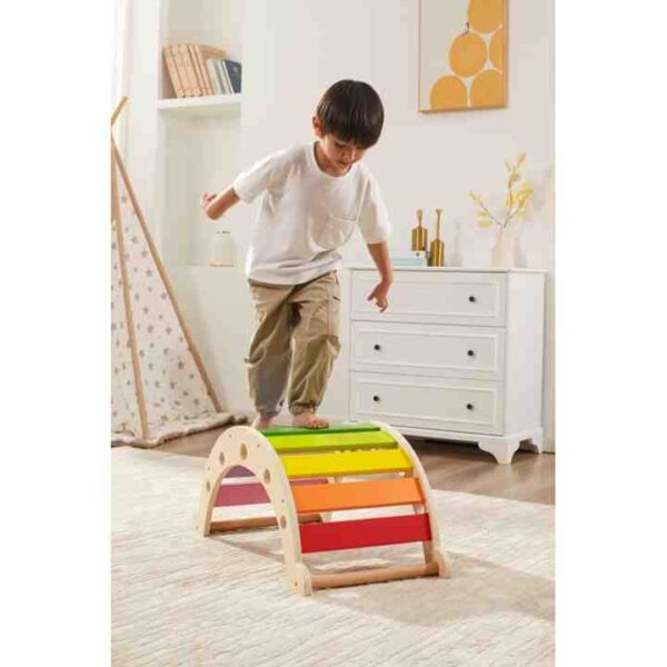 Mavrični gugalnik 2/1 znamke VIGA, ki bo s svojo zasnovo otrokom ponudil neskončno zabavo. Oblikovanje in možnosti uporabe gugalnice se popolnoma ujemajo s filozofijo Montessori. Gugalnik se uporablja za igro ravnotežja in podpira razvoj motoričnih sposobnosti. Lesen, varen, pisan, zahvaljujoč kateremu podpirate celovit razvoj otroka. Večnamenskost gugalnica spodbuja ustvarjalnost, otrok se lahko guga, razteza, pleza – naredi vse, kar je potrebno za naravni razvoj skozi gibanje. Obrnjen na glavo postane odličen most za nove dogodivščine naproti. Ne glede na to, kako se uporablja, bo otrokom pomagal izboljšati moč, ravnotežje in koordinacijo. Izdelek pobarvan s svetlimi nestrupenimi barvami.