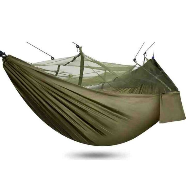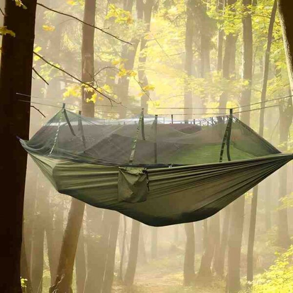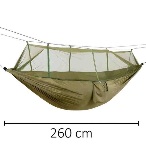 Komplet viseče mreže z mrežo za preprečevanje pikov komarjev je primerna za potovanje in miren spanec, kjer koli že ste. Komplet je lahek za prevoz in enostaven za namestitev. Mreža je opremljena s praktično mrežo proti komarjem in drugim insektom, saj ima praktično zadrgo za odpenjanje in zapenjanje. Zunanja viseča mreža je izdelana iz trpežnega, dvoslojnega vojaškega najlona s padalom 210T.  Njegova konstrukcija je močna in trpežna, vendar zračna in zelo lahka. Kljub majhni teži 900 g, prenese obremenitev do 100 kg in ostaja izjemno stabilen v mirovanju. Zaradi elegantnega videza se prilega vsakemu okolju.