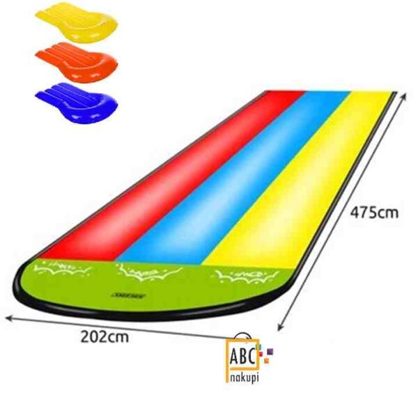 Vodni tobogan ali drsalnica je odličen za igranje z brati in sestrami ali prijatelji na sončen, vroč dan! Da bi se vaš otrok zabaval med počitnicami, postavite vodni tobogan na vrtu. Drsenje po gladki površini tobogana ni le odlična zabava, temveč tudi odličen način, da se ohladite na vroč dan. Priprava na uporabo in namestitev na vrtu bo trajala le nekaj trenutkov. Na eni strani tobogana je vodna stena, majhen rezervoar za vodo, ki se nahaja na koncu tobogana, pa zagotavlja neverjetno pljuskanje, ki bo razveselilo vse udeležence igre. Trojna steza vam omogoča, da hkrati dsajo trije otroci.