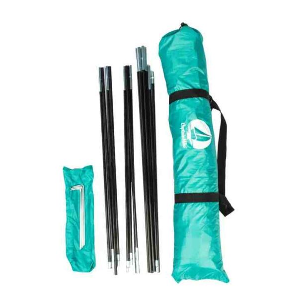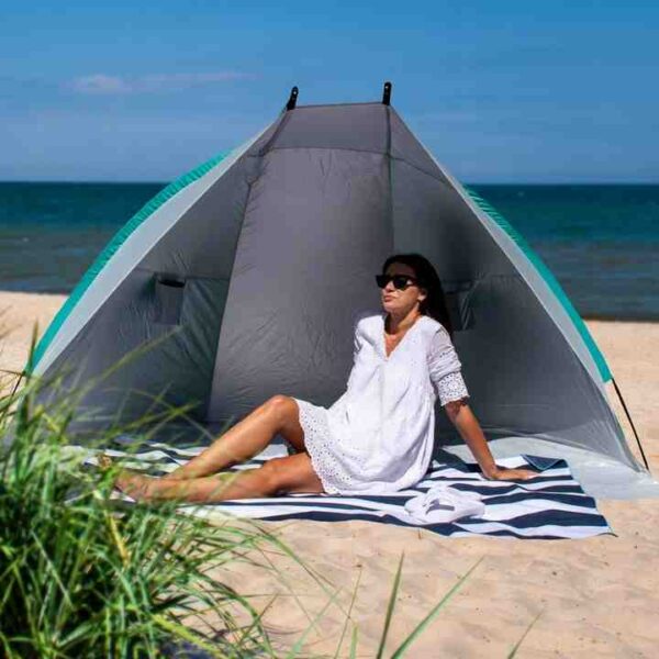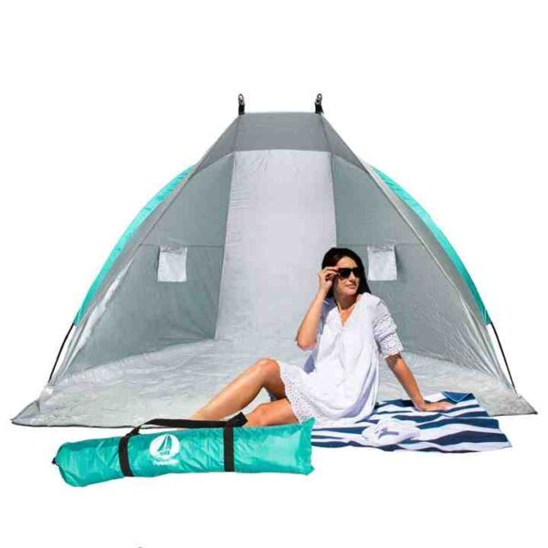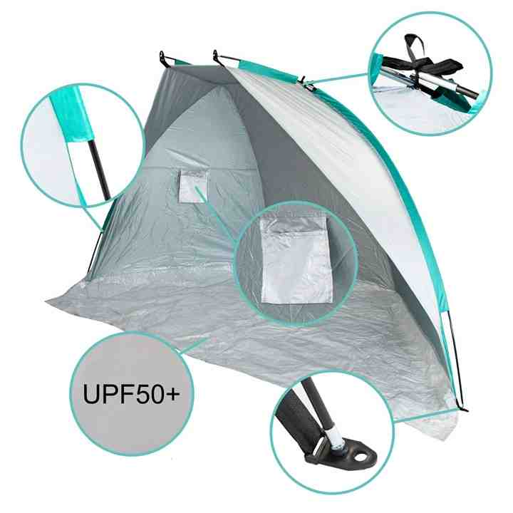 Trpežen šotor, predvsem lahek za transport, praktičen in vsestranski šotor, ki ga lahko uporabljate ne samo na plaži, ampak tudi na vrtu, v kampu ali na terasi in balkonu. Šotor je izdelan iz trpežnega poliestrskega materiala. Premaz, ki ga je potrdil laboratorij TÜV Rheinland Group, zagotavlja zaščito pred soncem UPF50+! Hitro postavljiv šotor, ki bo zagotovil zaščito pred vetrom in soncem za vas in vašo družino. Širina do 2,4 metra omogoča udobno ležanje cca 4 osebam v notranjosti!