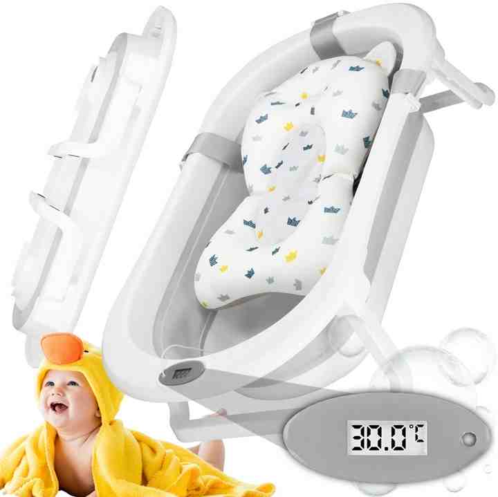 Poskrbite za varno in udobno kopanje vašega dojenčka že od prvih trenutkov njegovega življenja Prve otroške kopeli so izjemno razburljive in stresne. V pomoč bo ustrezno opremljena kad, ki bo olajšala to izjemno težko nalogo, s katero se bo soočal vsak starš začetnik. Zložljiva kad je praktična rešitev za vse starše, ki imajo manjše prostore. Kadi je priložen ergonomski vzglavnik, ki vašemu otroku zagotavlja izjemno udobje med kopanjem. Narejen je iz visoko kakovostnih materialov – mehkega poliestra na zunanji strani in polnila iz polistirenskih kroglic, ki se odlično prilagajajo obliki otrokovega telesa. Blazina je opremljena s 3 praktičnimi pritrdilnimi trakovi, ki omogočajo trdno pritrditev na rob kadi. Zahvaljujoč temu lahko otrok prosto in varno počiva v vodi in ste lahko prepričani, da je vse na svojem mestu. Velika prednost banice je njeno hitro zlaganje. Opremljen z elektronskim termometrom za merjenje temperature vode, z zaslonom s tekočimi kristali, napolnjenost baterije: 2x LR44, baterije so vključene; natančnost termometra do 0,1 stopinje Celzija. Zahvaljujoč tej funkcionalnosti, boste prihranili prostor doma in jo, če je potrebno odnesli kamorkoli s seboj.