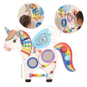 Večnamenska senzorična plošča- Viga Toys s podobo Unicorna je sestavljena: iz 4 delov in ima 8 različnih igralnih funkcij. Pisan Unicorn ponuja; zobniški prenos, spirala kroglic, konkavno in konveksno ogledalo, labirint z magnetnimi kroglicami in metalofon.