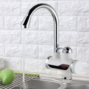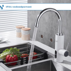 Pretočna električna grelna pipa WELL Billabong, ki jo odlikuje eleganten, modernim dizajn, pregleden digitalni prikazovalnik temperature vode, moč 3000W, rotacija za 360°, zaščita IPX4, ter kakovostna izdelava iz nerjavečega jekla in ABS plastično ohišje.