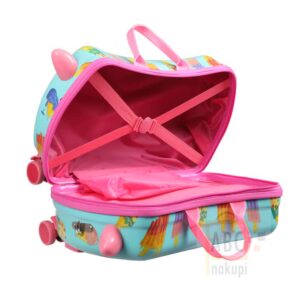 Otroški potovalni kovček – Sladoled, velikosti 47 x 23,5 x 31 cm je izjemno prostoren, saj ima dva velika predala (tudi eden na zadrgo) nudita dovolj prostora za vse potrebne stvari: oblačila, plišaste živali in vse ostalo. Kovček ima dodatno funkcijo – lahko se uporablja kot sedež in celo kot voziček za otroke! Otrok lahko kovček vleče.