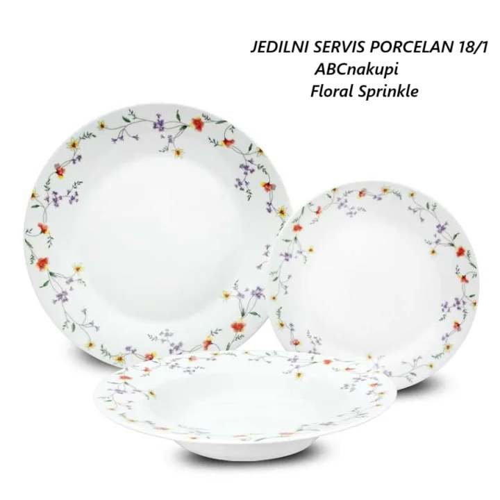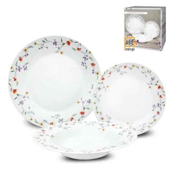Predstavljamo vam 18 delni jedilni set! Vrhunski set posode odporne na praske in udarce. Izdelan iz visokokakovostnega porcelana, primeren za mikrovalovno pečico in pomivalni stroj. Poseben način izdelave zagotavlja dolgotrajno kakovost in lesk z obeh strani. Set vsebuje: 6 velikih plitkih krožnikov (27cm) 6 globokih krožnikov (22 cm) in 6 desertnih krožnikov (19 cm) Naj vam krožniki poživijo vašo kuhinjo in ob serviranju dajo jedem poseben čar.