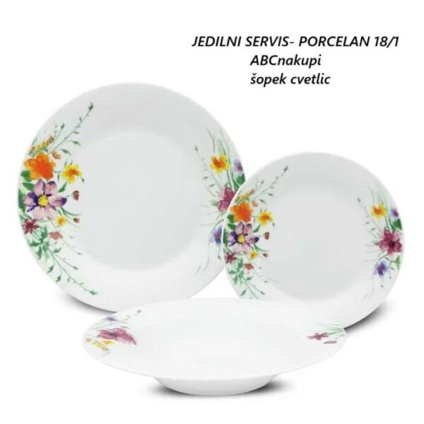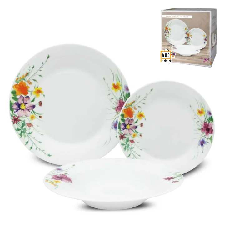 Predstavljamo vam 18 delni jedilni set! Vrhunski set posode odporne na praske in udarce. Izdelan iz visokokakovostnega porcelana, primeren za mikrovalovno pečico in pomivalni stroj. Poseben način izdelave zagotavlja dolgotrajno kakovost in lesk z obeh strani. Set vsebuje: 6 velikih plitkih krožnikov (27cm) 6 globokih krožnikov (22 cm) in 6 desertnih krožnikov (19 cm). Naj vam krožniki poživijo vašo kuhinjo in ob serviranju dajo jedem poseben čar.