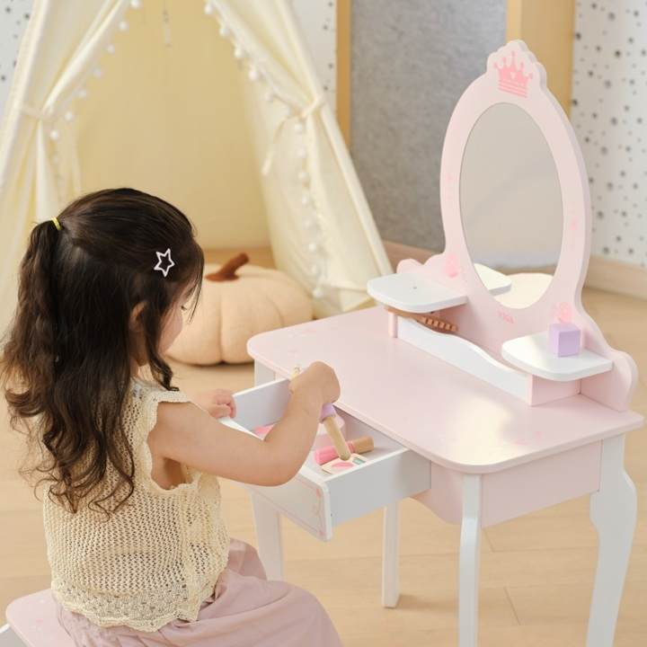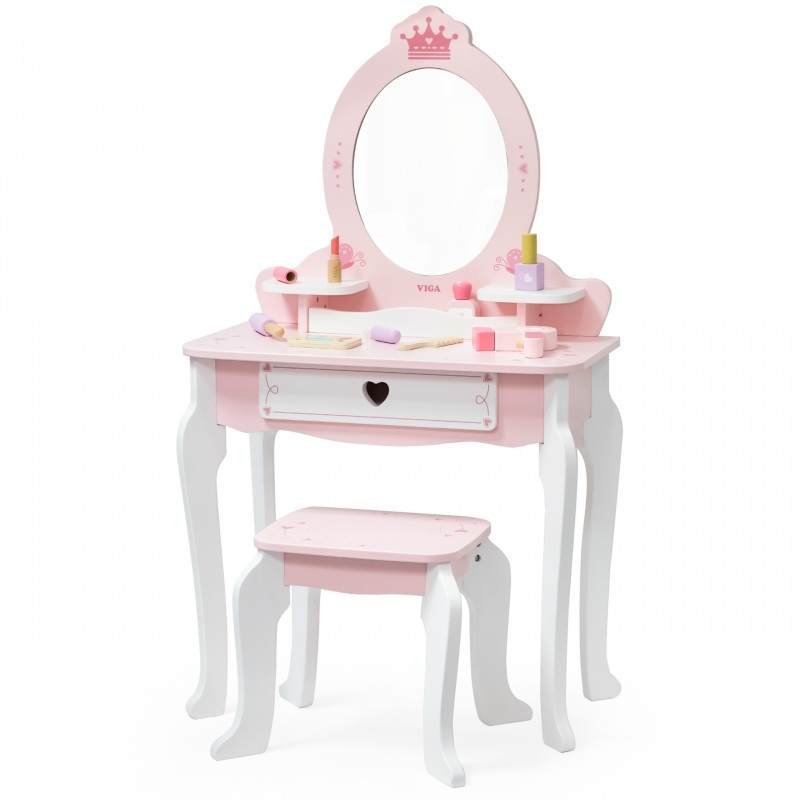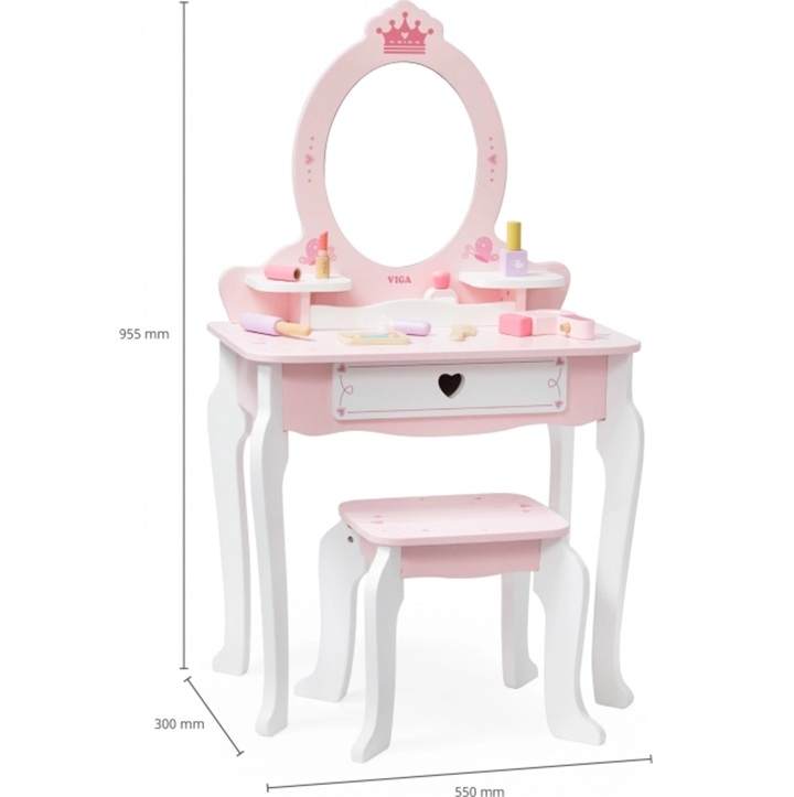 Lesena kozmetična mizica s stolom je igrača, ob kateri se bo vaša princeska rada igrala. Malčice bodo uživale v igranju s kakovostno, varno in uporabno kozmetično mizico s stolom in dodatki. Lesena kozmetična mizica znamke- Viga je edinstvena lesena toaletna mizica za majhno princesko , ki bo izpolnila sanje vsake deklice! Ta očarljiva kozmetična mizica, izdelana iz najkakovostnejšega lesa v nežnih odtenkih roza in bele, očara s svojim pravljičnim dizajnom. Je tudi odlično darilo – njena trdna konstrukcija in estetski videz bosta zagotovila, da bo zdržala leta.