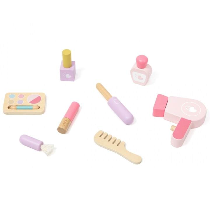 -Set vključuje: toaletna mizica, otroški stolček, lesena paleta za ličenje s čopičem, šminka v elegantni embalaži, lesen lak za nohte, steklenička za parfum v roza odtenku, glavnik za lase, mehak čopič za puder in sušilnik za lase z zamenljivimi konicami